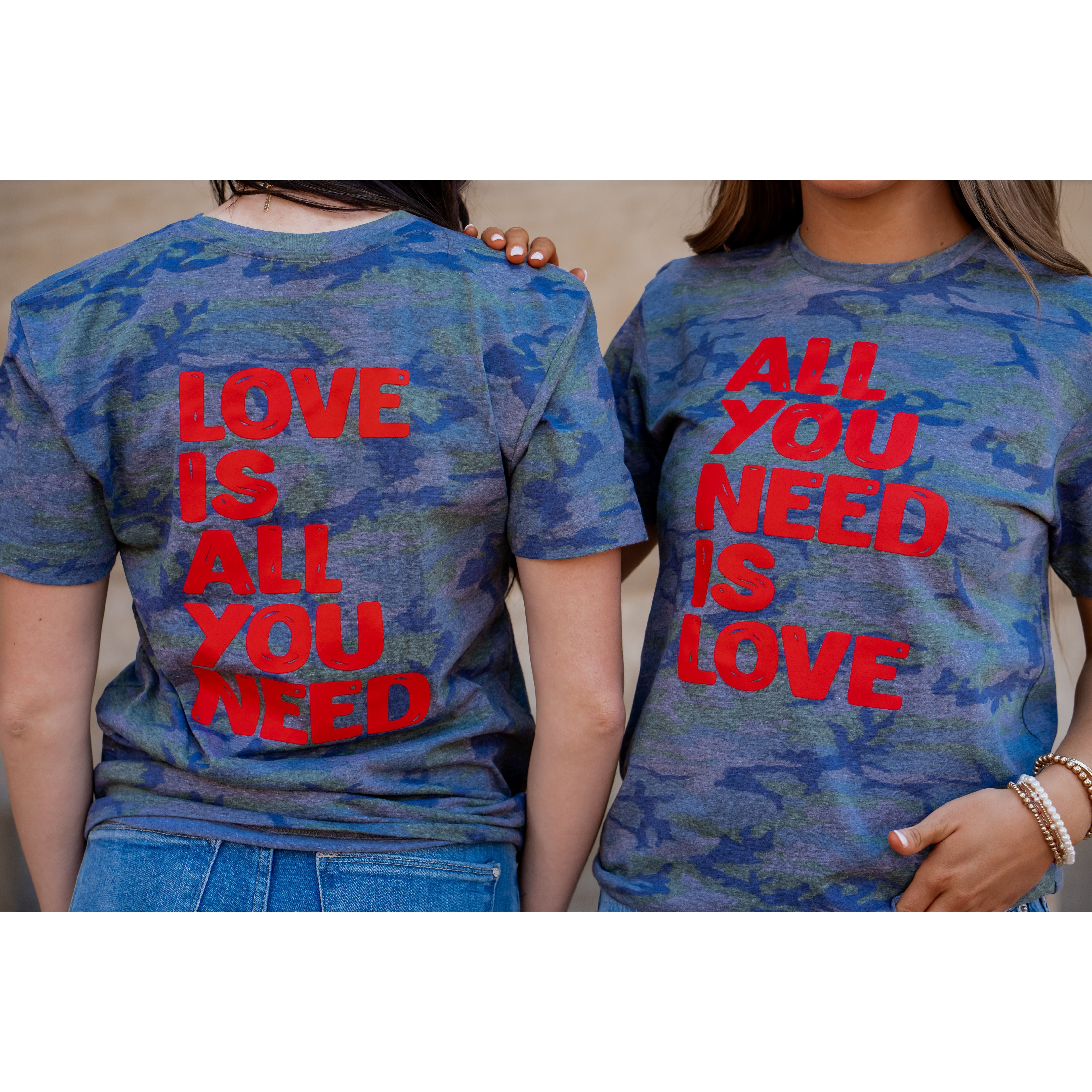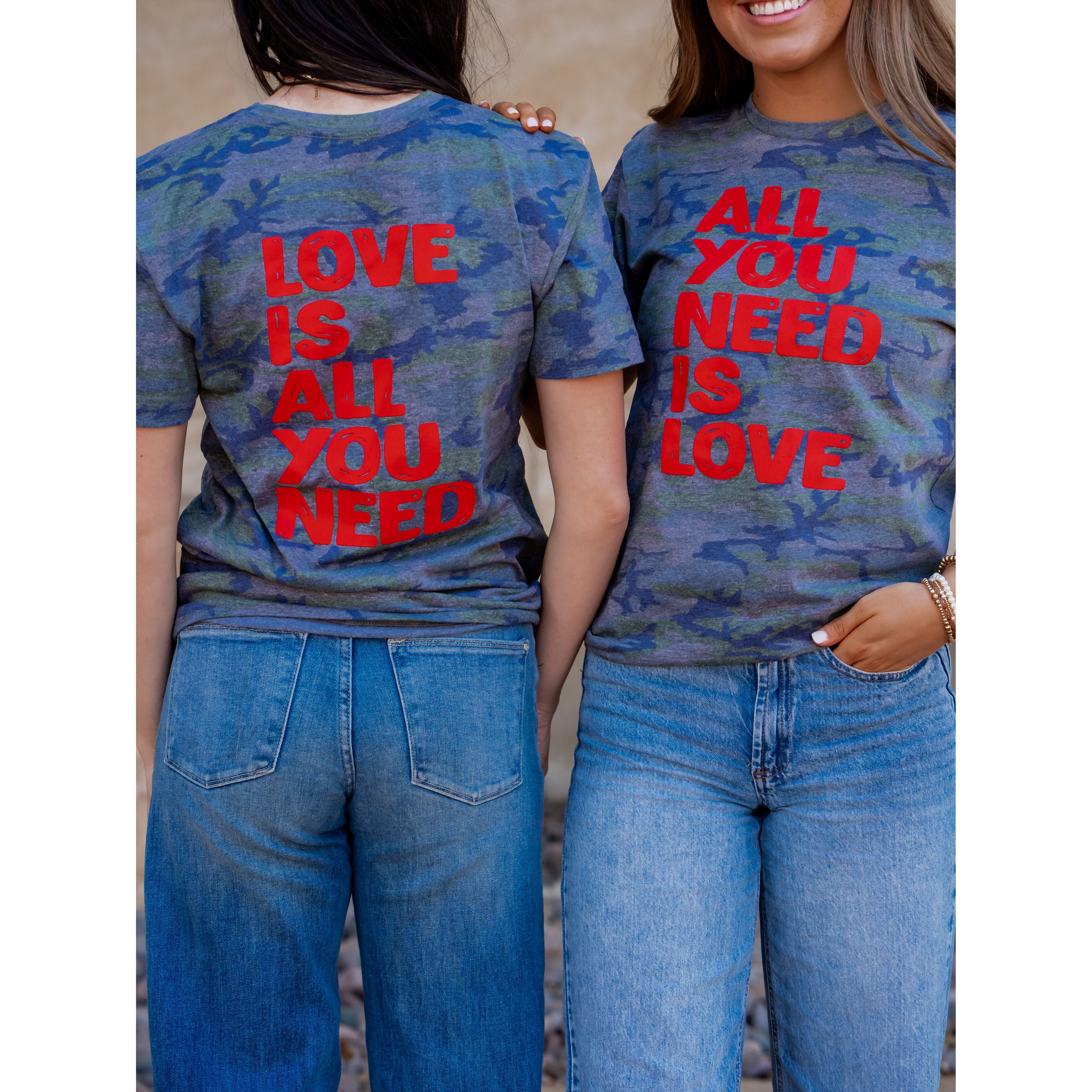 All you need is love! Celebrate Valentine's Day with a unique twist with this All You Need is Love Camo graphic tee. Featuring bold lettering with trendy camouflage print accents, this tee is perfect for showing off your love for the season while adding a fun, unexpected edge to your Valentine's style.