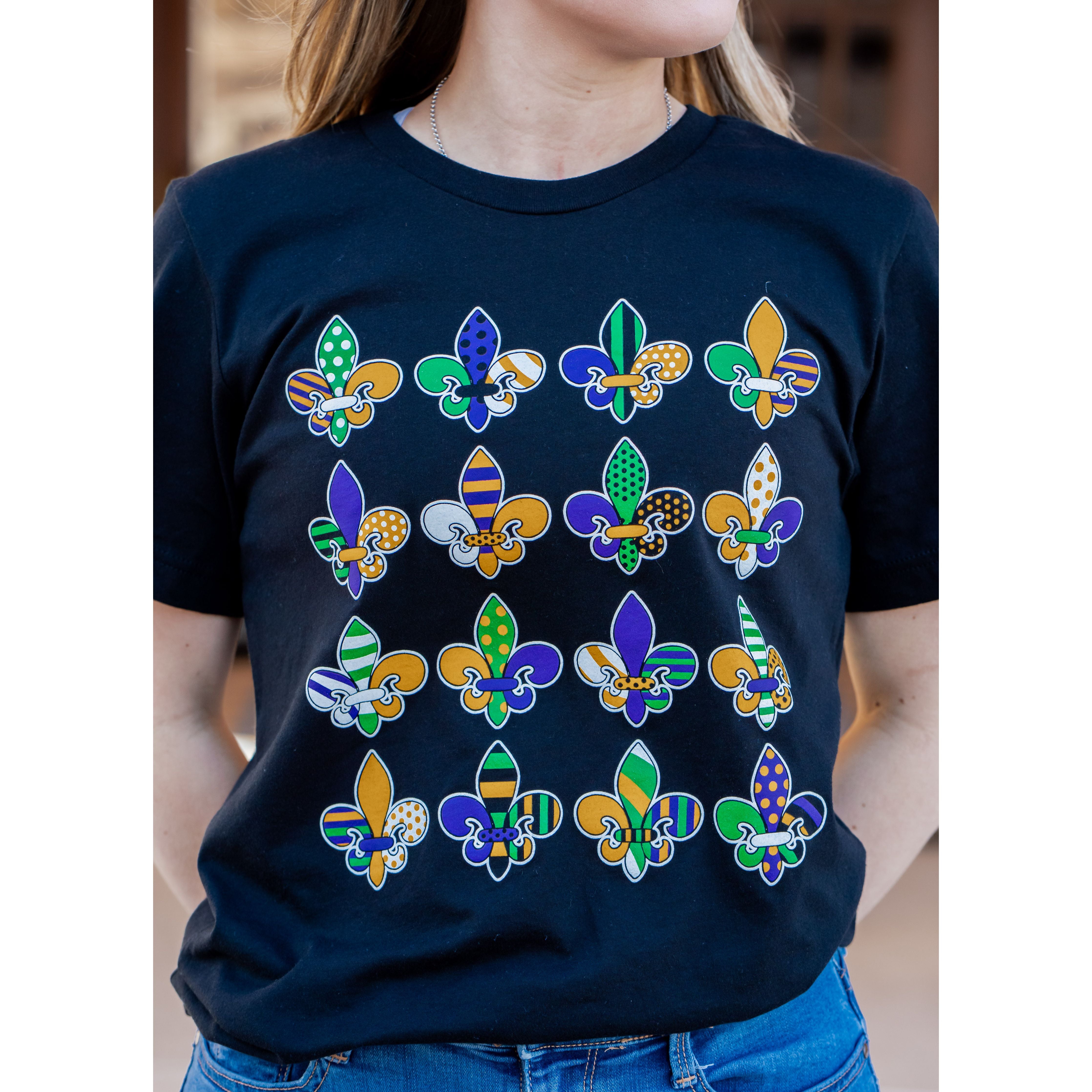 Celebrate Mardi Gras with classic elegance! This stunning Fleur De Lis patterned graphic tee features the iconic symbol of New Orleans in traditional Mardi Gras colors. The beautiful repeating fleur de lis pattern creates a sophisticated yet festive look that's perfect for Fat Tuesday celebrations and beyond.