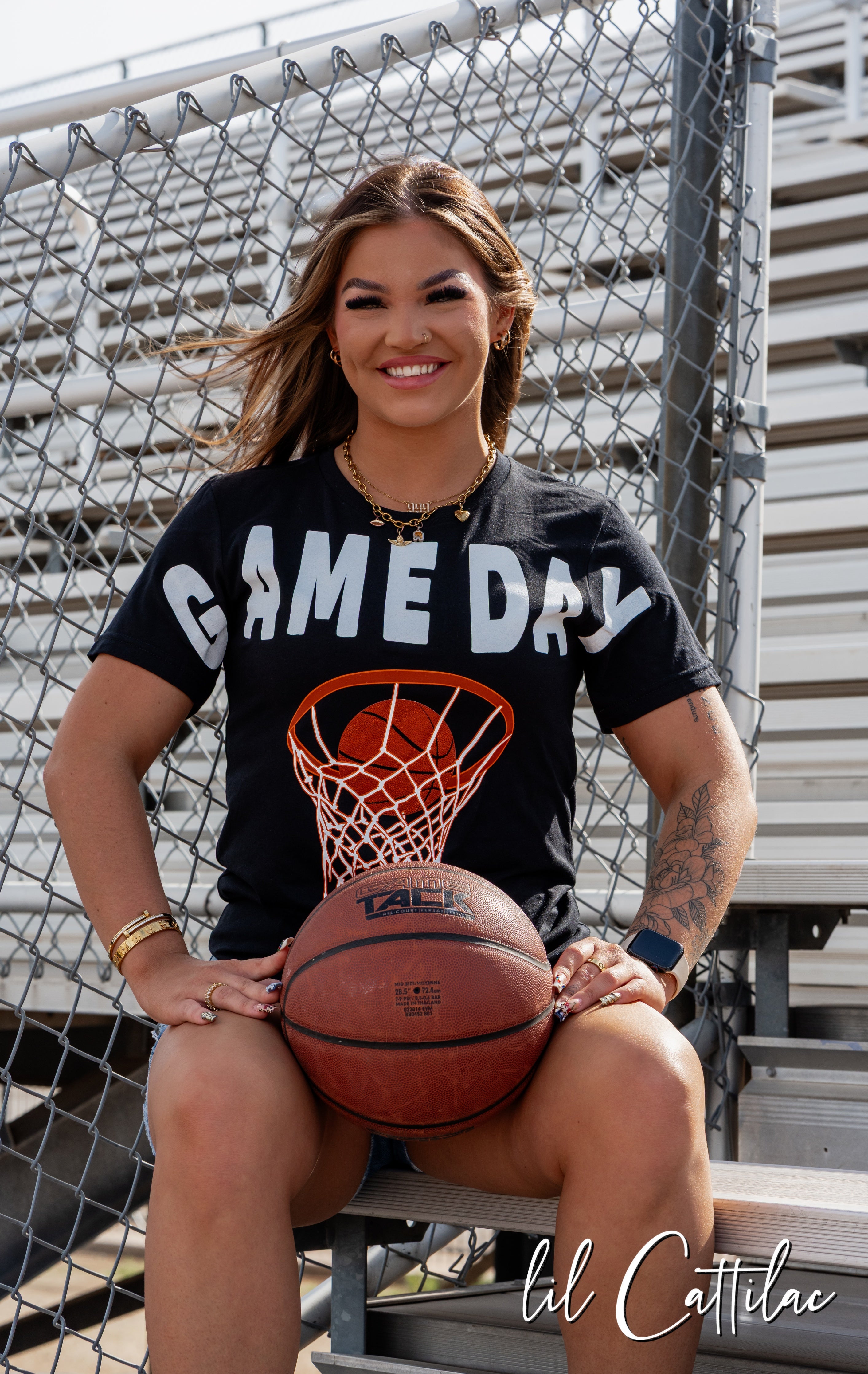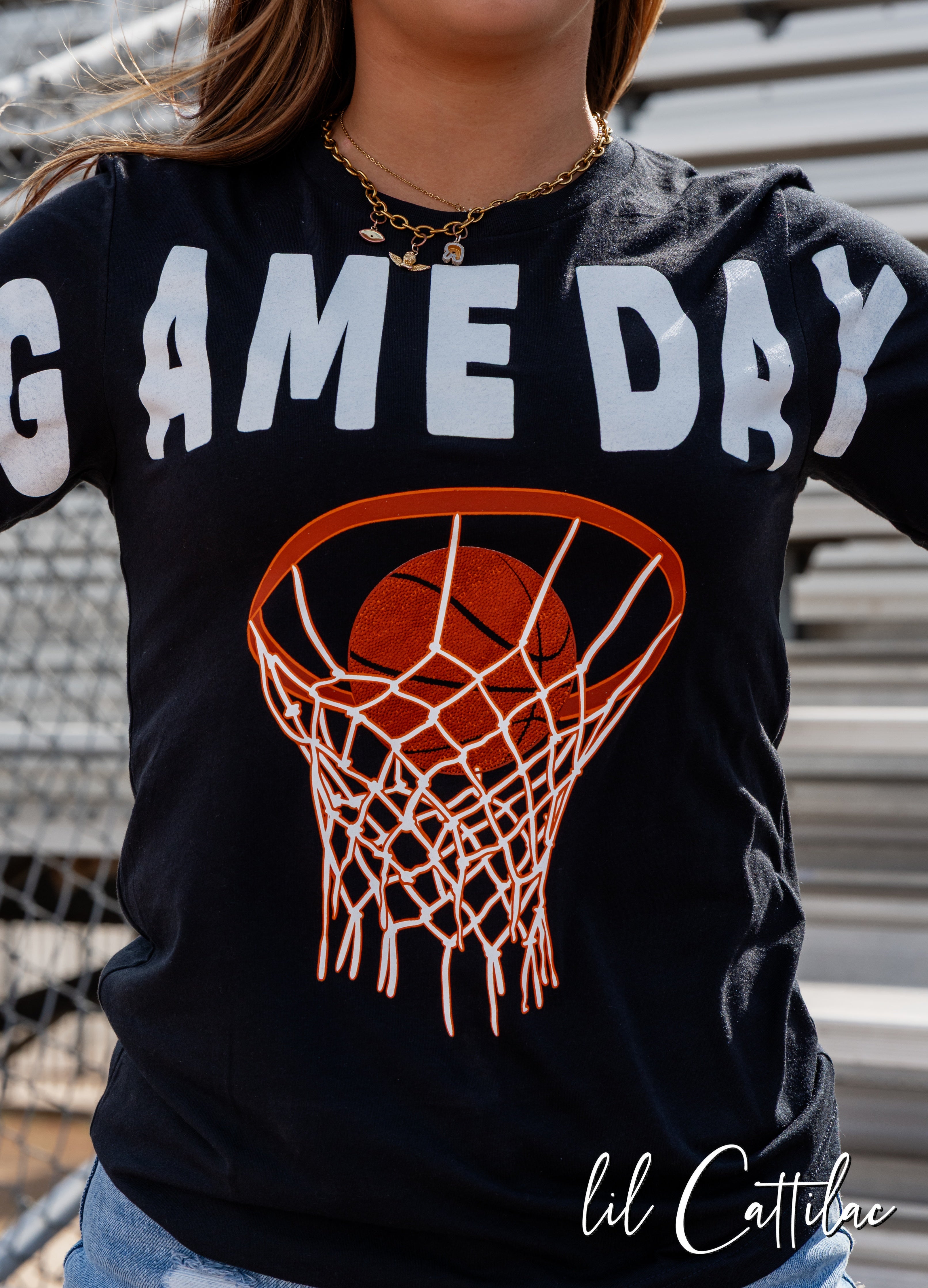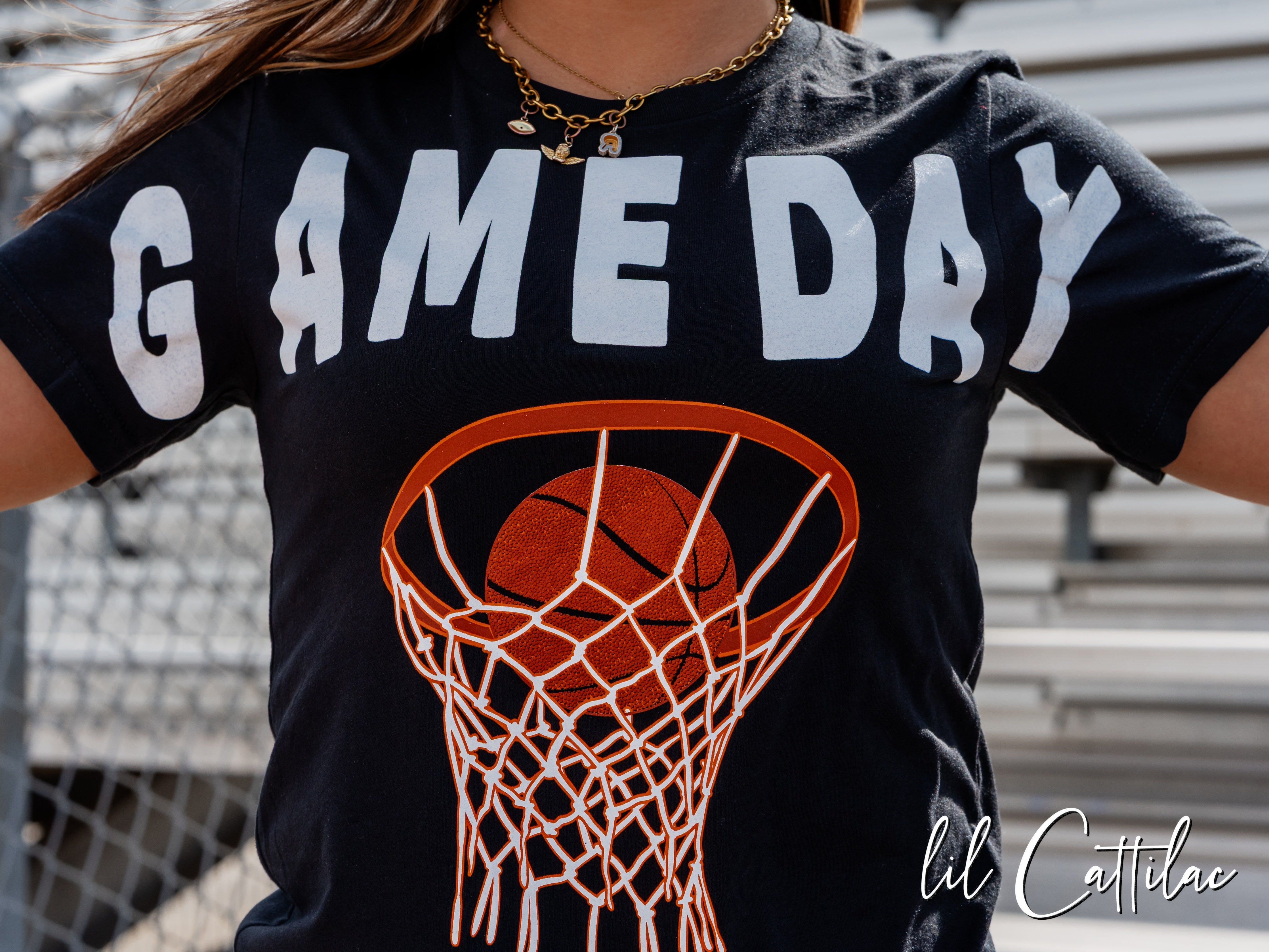 Simple. Bold. Game day perfection. This basketball hoop graphic paired with clean block lettering makes it a slam dunk for any fan or player.