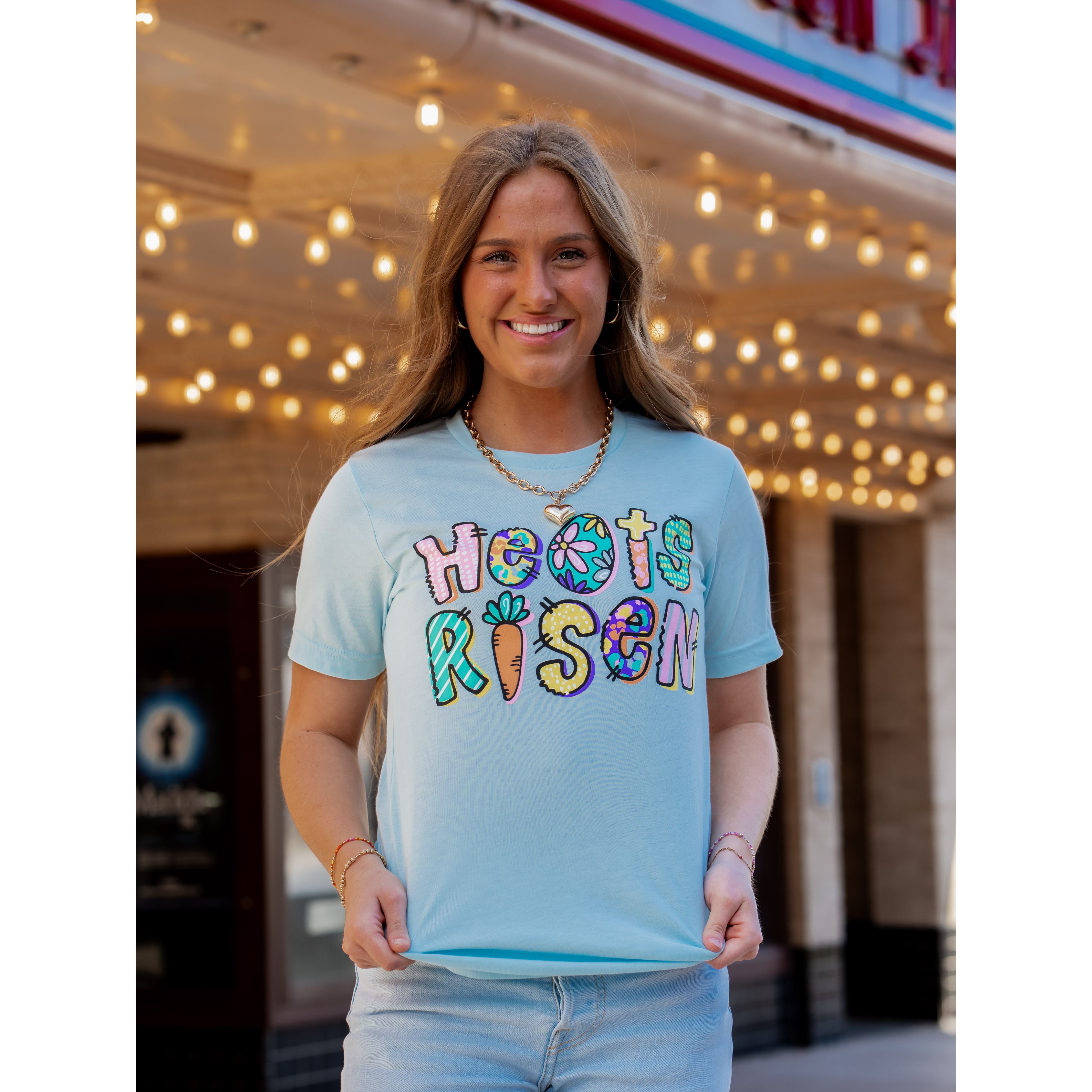 Celebrate the resurrection with this beautiful Easter tee that proclaims the good news - He has risen!