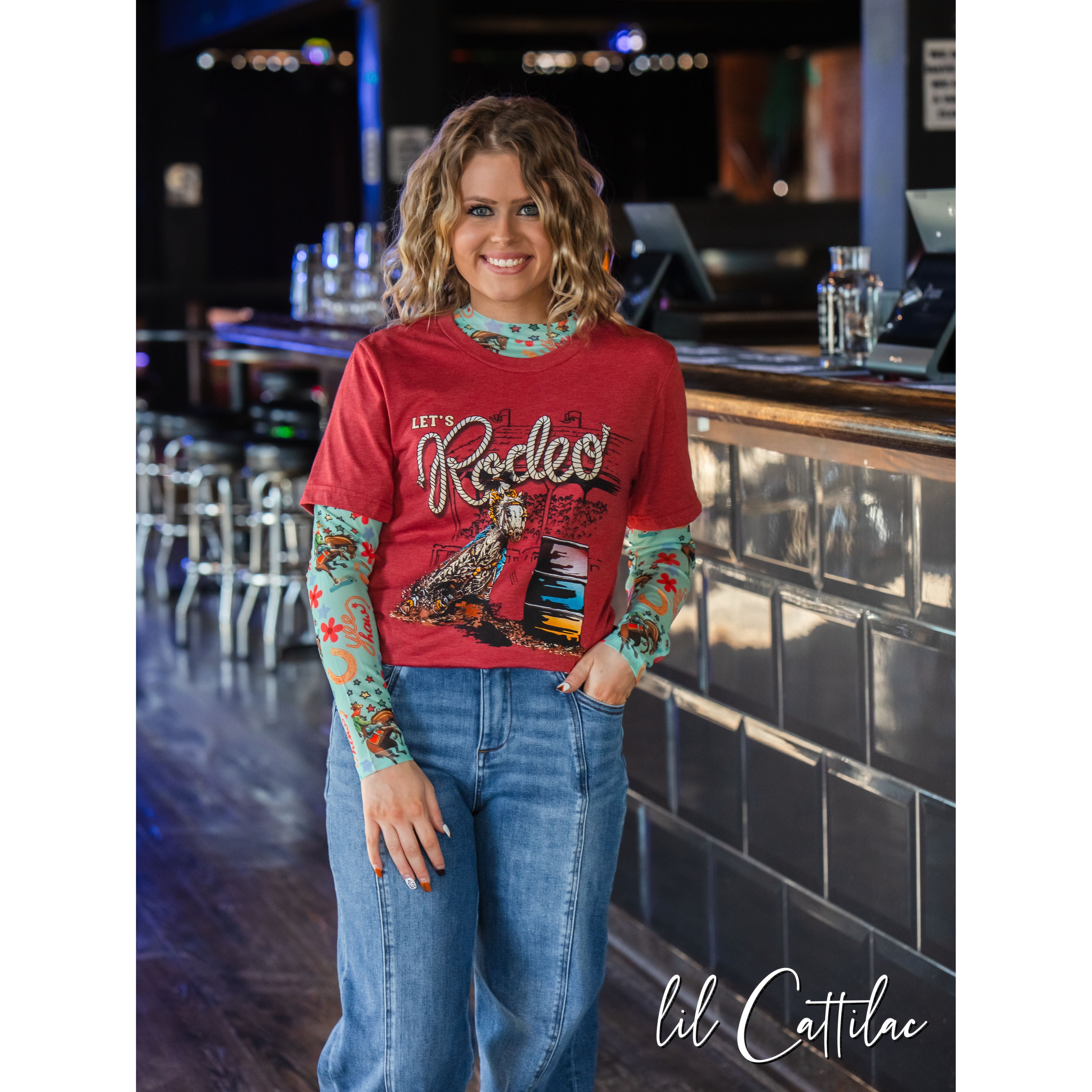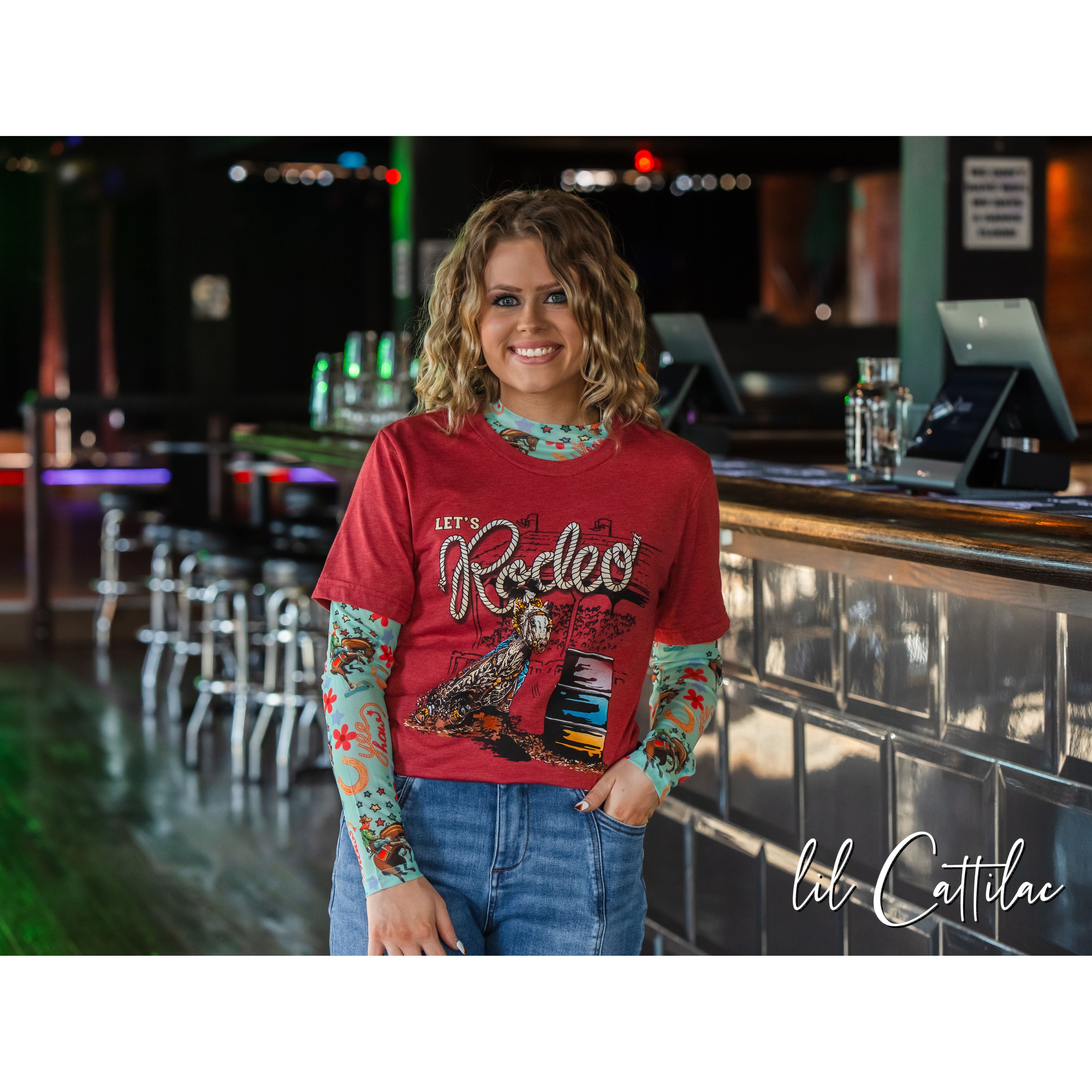 Let's rodeo! Celebrate the thrill of barrel racing with this bold Let's Rodeo Barrel Racer graphic tee. Featuring a striking design of a barrel racer in action with vibrant colors and dynamic movement, this tee is perfect for rodeo fans, barrel racers, and anyone who loves the speed and excitement of the arena!