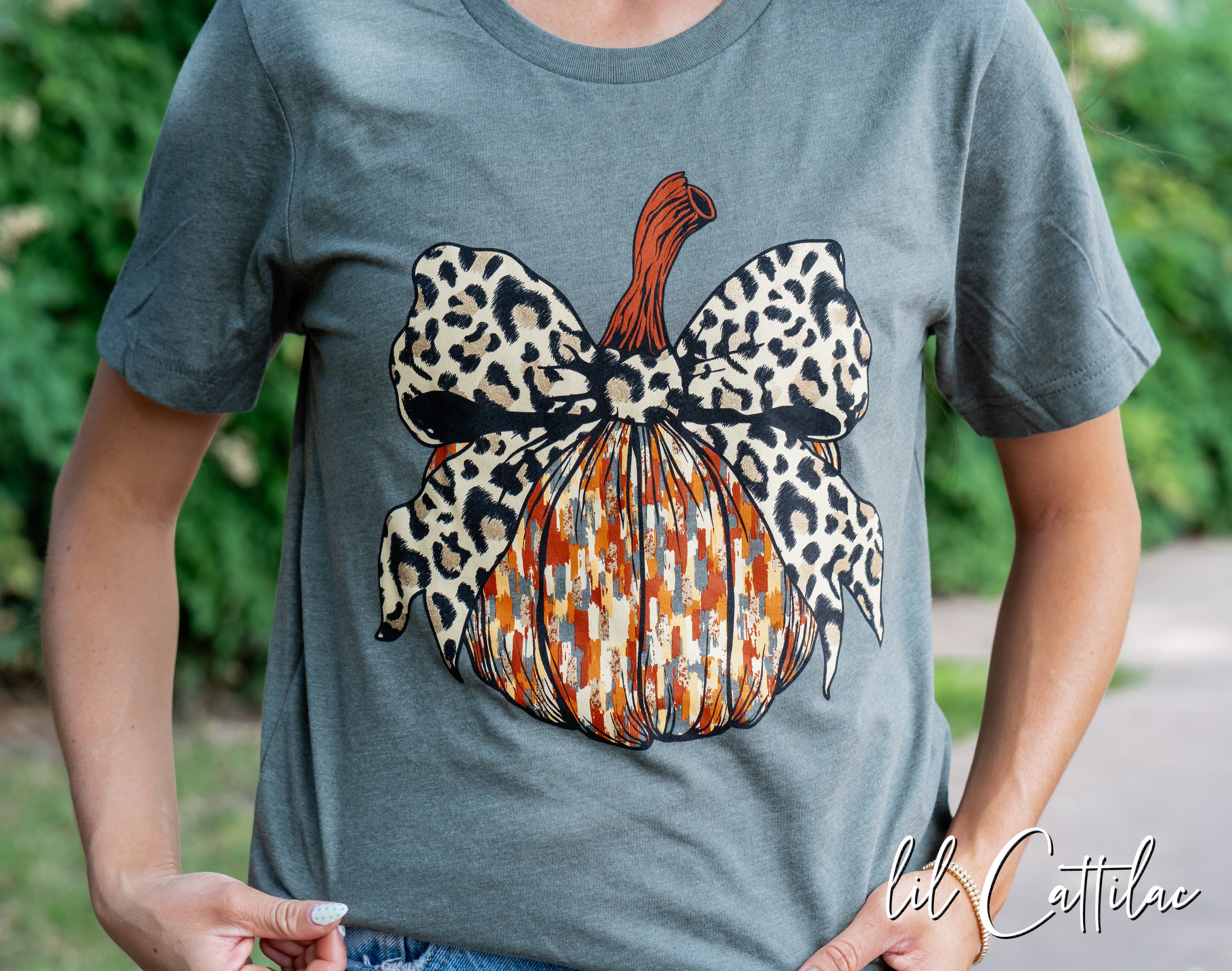 This pumpkin’s got personality! A mix of leopard and plaid with a cute oversized bow makes this fall tee a fun and festive pick for Thanksgiving gatherings.