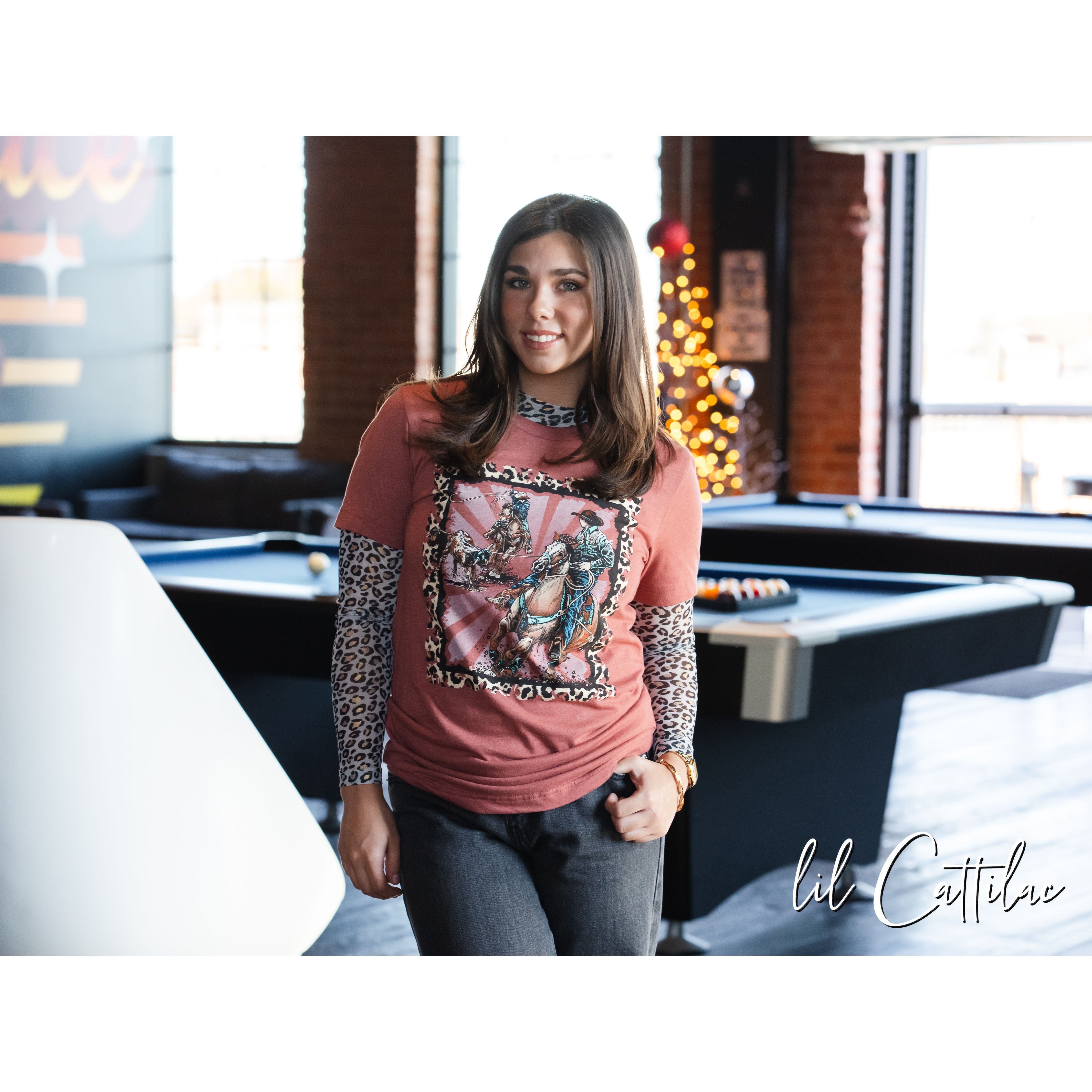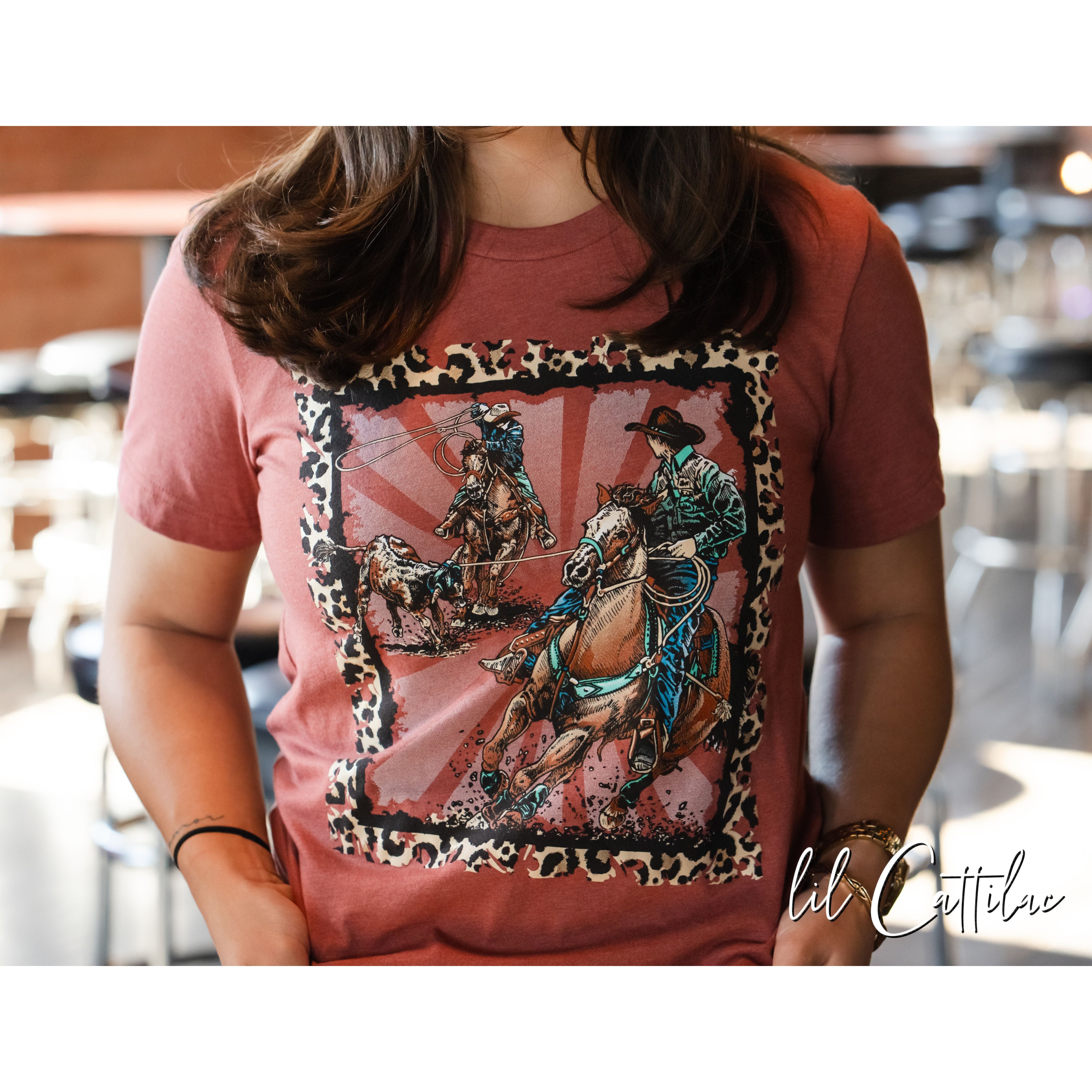 Let's rope! Celebrate the art of team roping with this bold Team Roper Leopard Border graphic tee. Featuring a striking design of a team roper in action with trendy leopard print border accents, this tee is perfect for rodeo fans, team ropers, and anyone who loves the thrill of the arena!