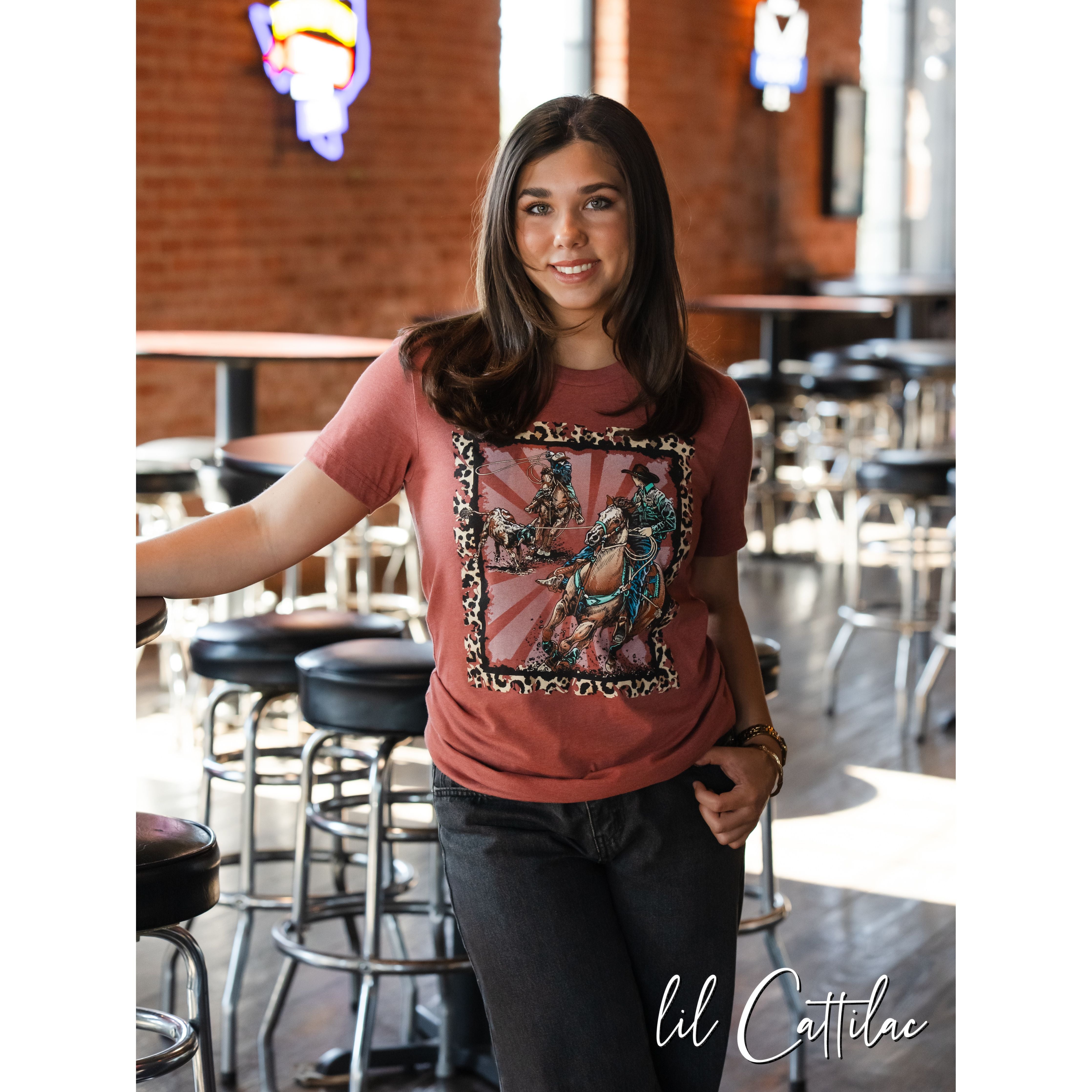 Saddle up and celebrate the skill of team roping with this trendy western tee!