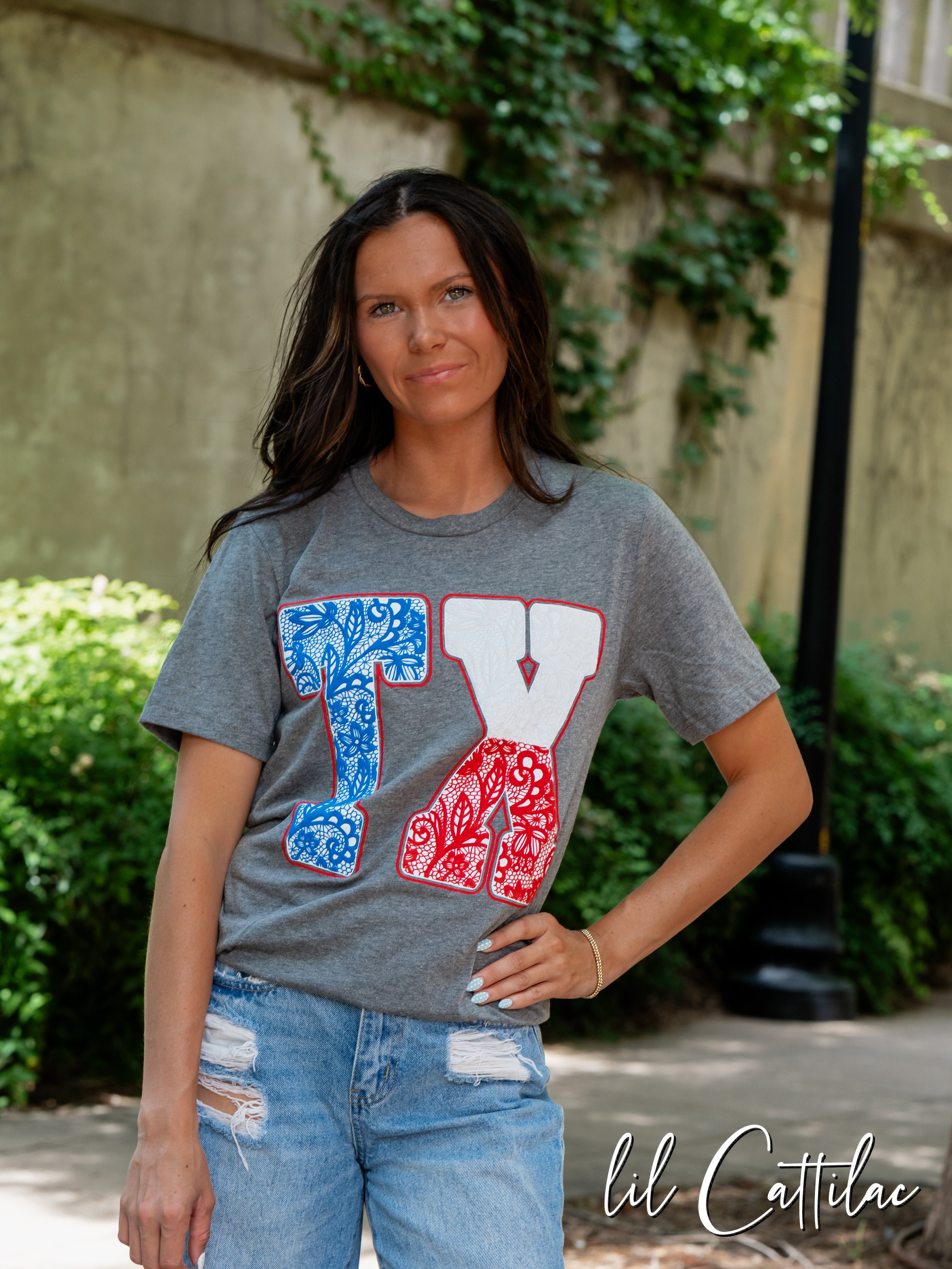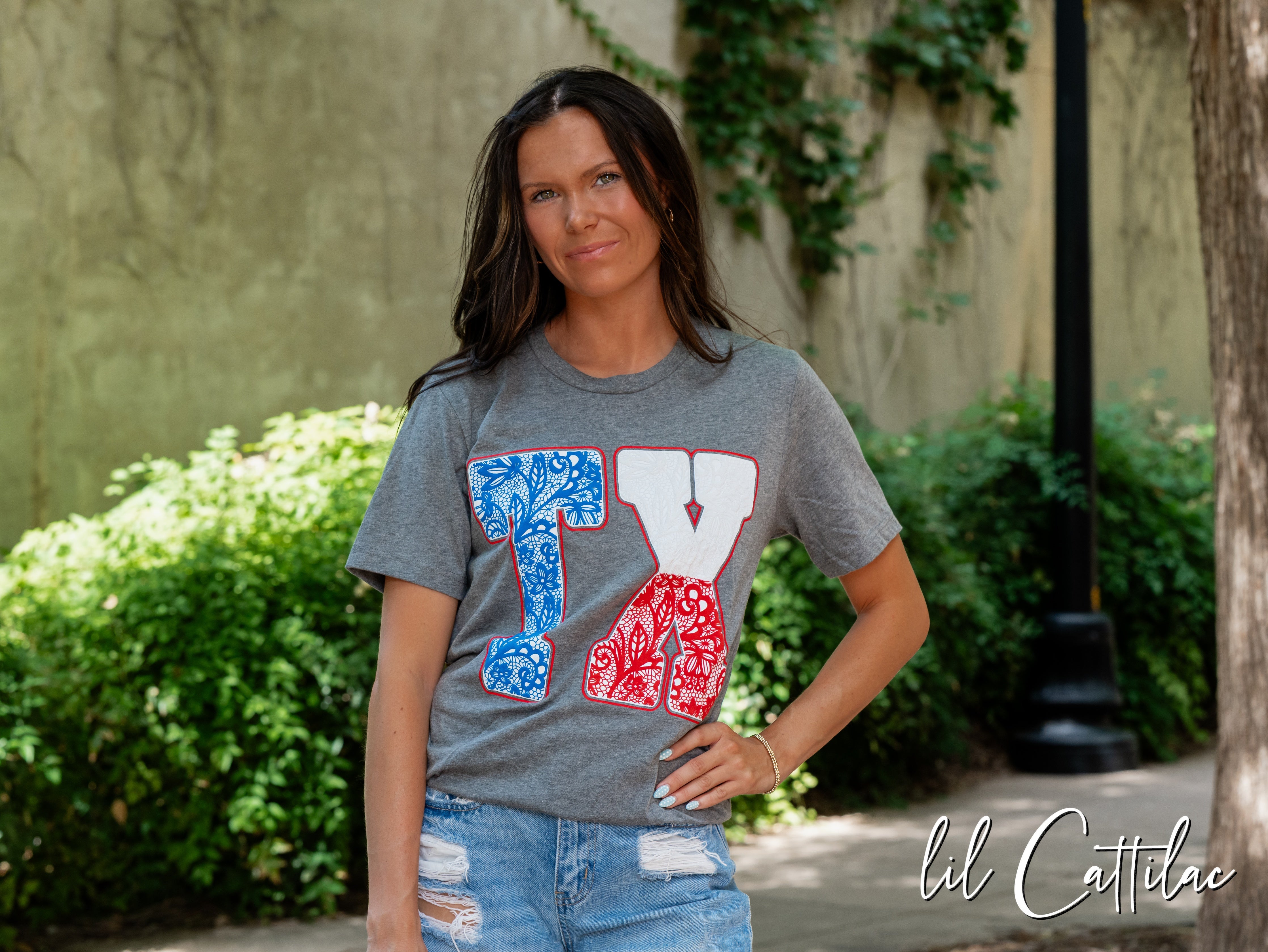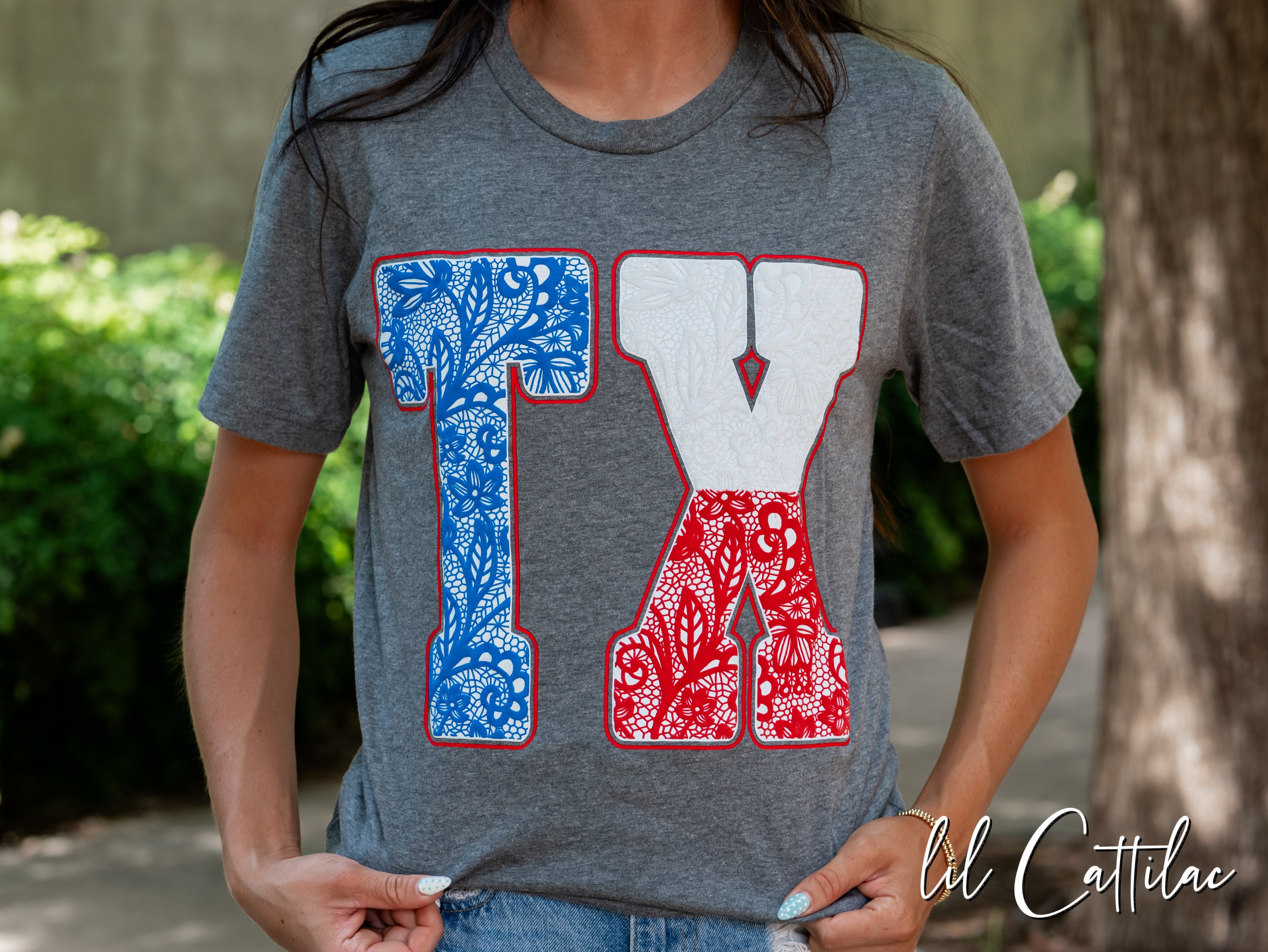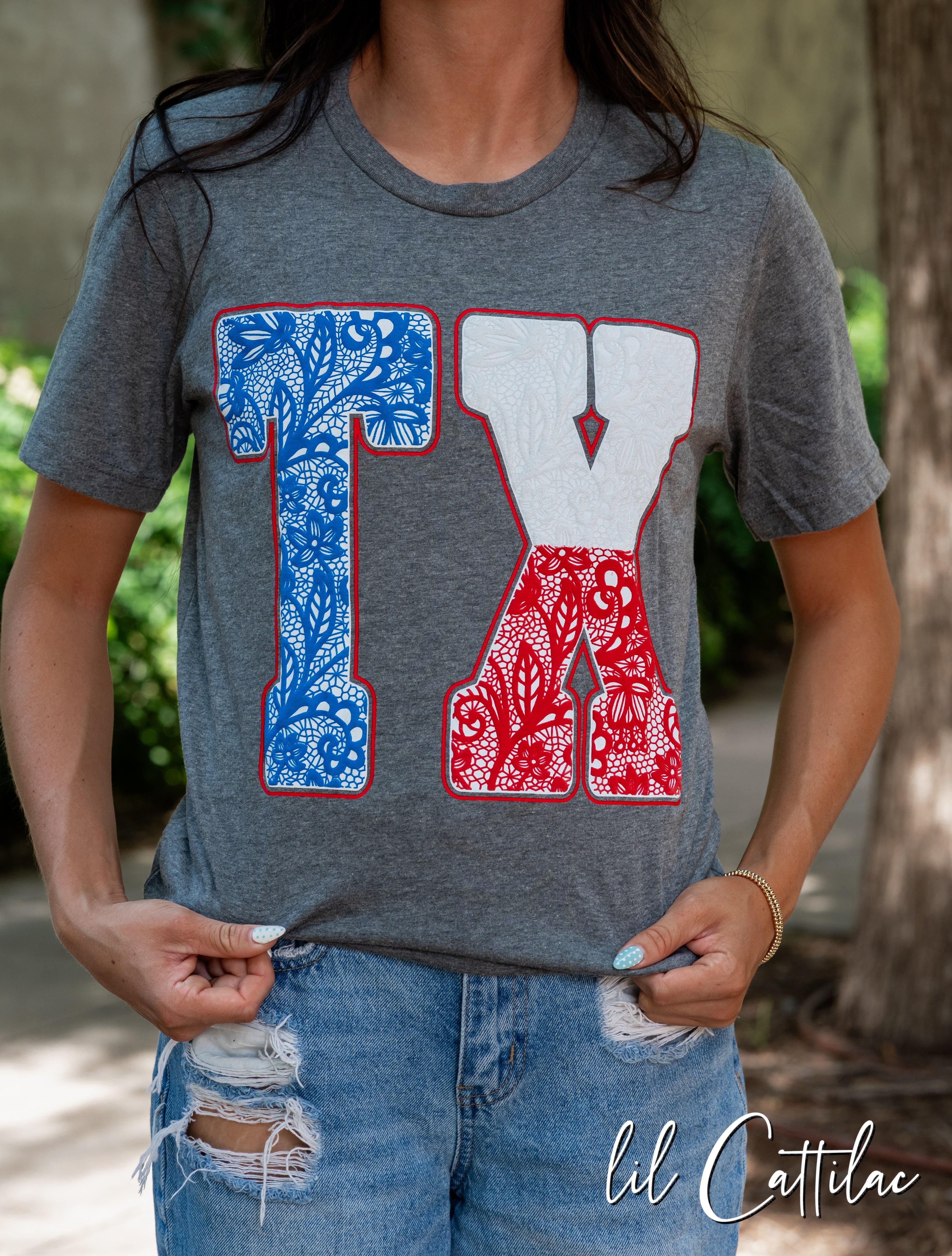 Feminine with a bold twist, this lace-inspired TX design pops with puff prints and layered detailing. It's a stylish shout-out to your Texas roots—soft, strong, and proud.