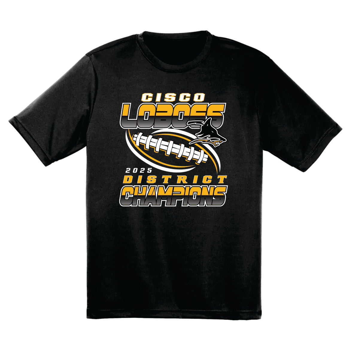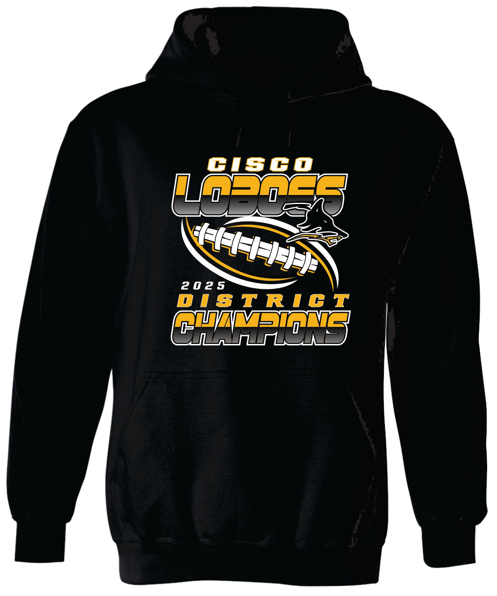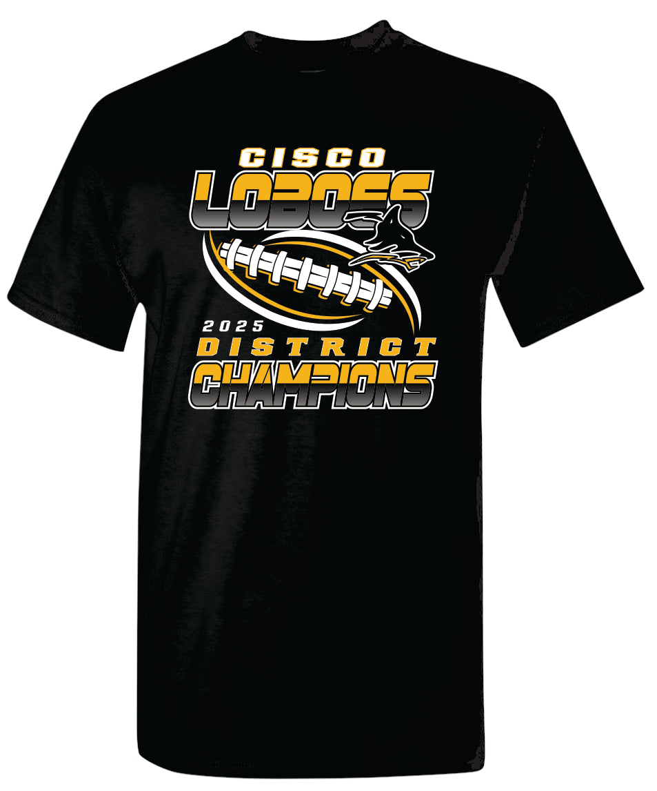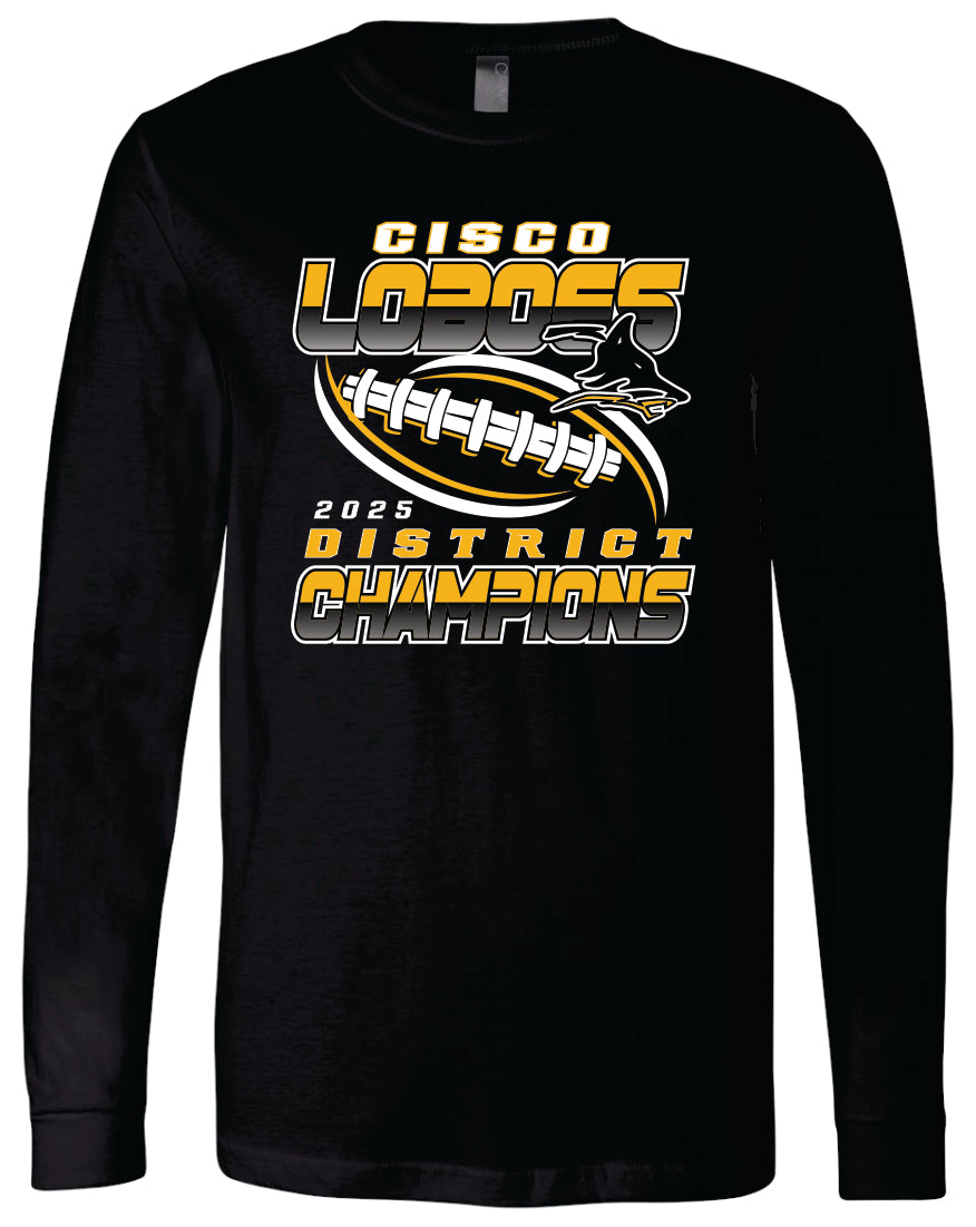 This is a Pre-Order. The DEADLINE to order is Sunday, November 9th. Show your support for the Cisco Loboes Football team with Playoff merchandise. Cisco Loboes with a Football Playoff design on the front with a Roster on the back of a Black tee. 7 Shirt options are available to choose from Short Sleeve or Long Sleeve - Cotton and Dry-Fit, Crewneck Sweatshirt and Hooded Sweatshirt.