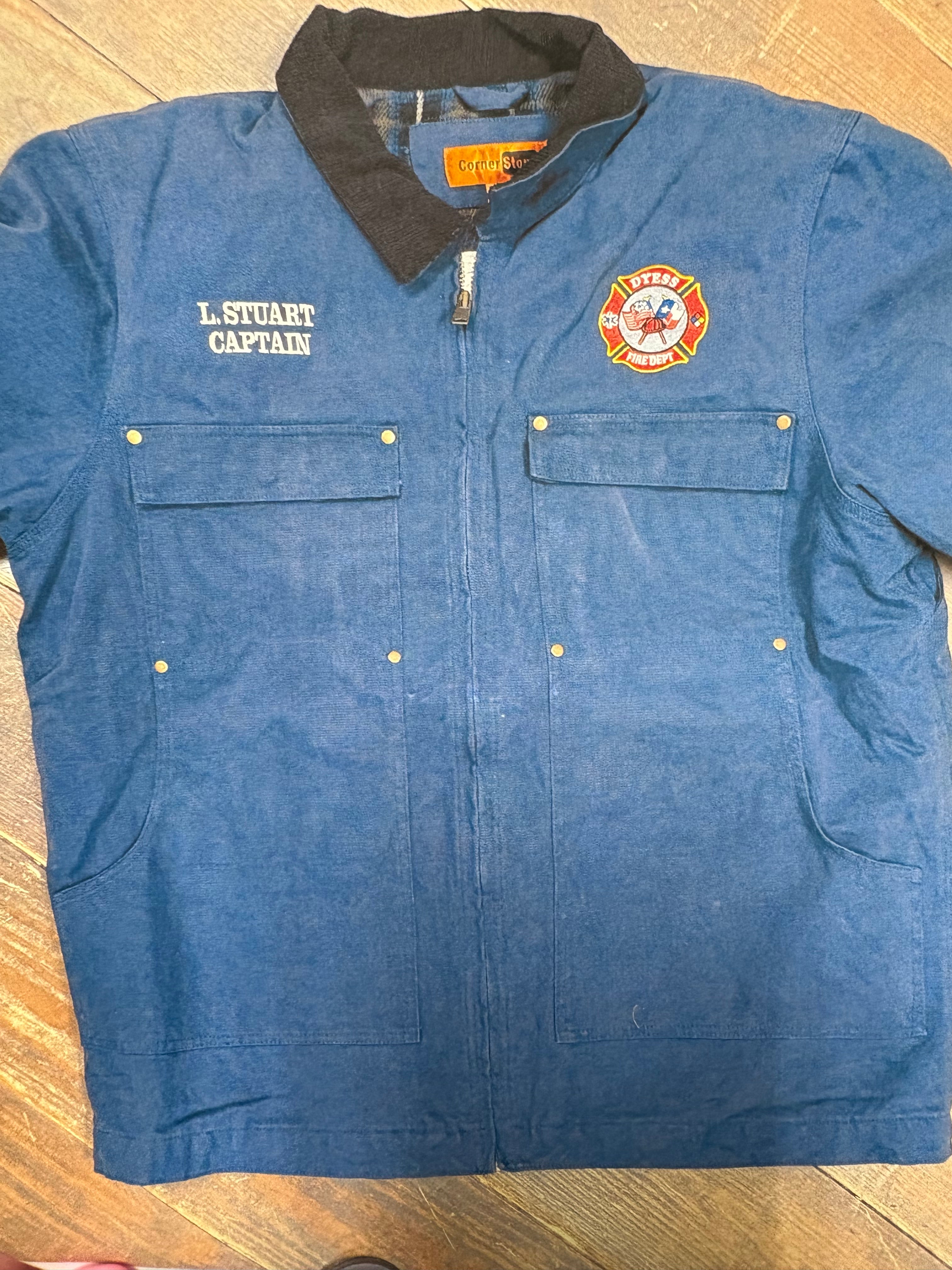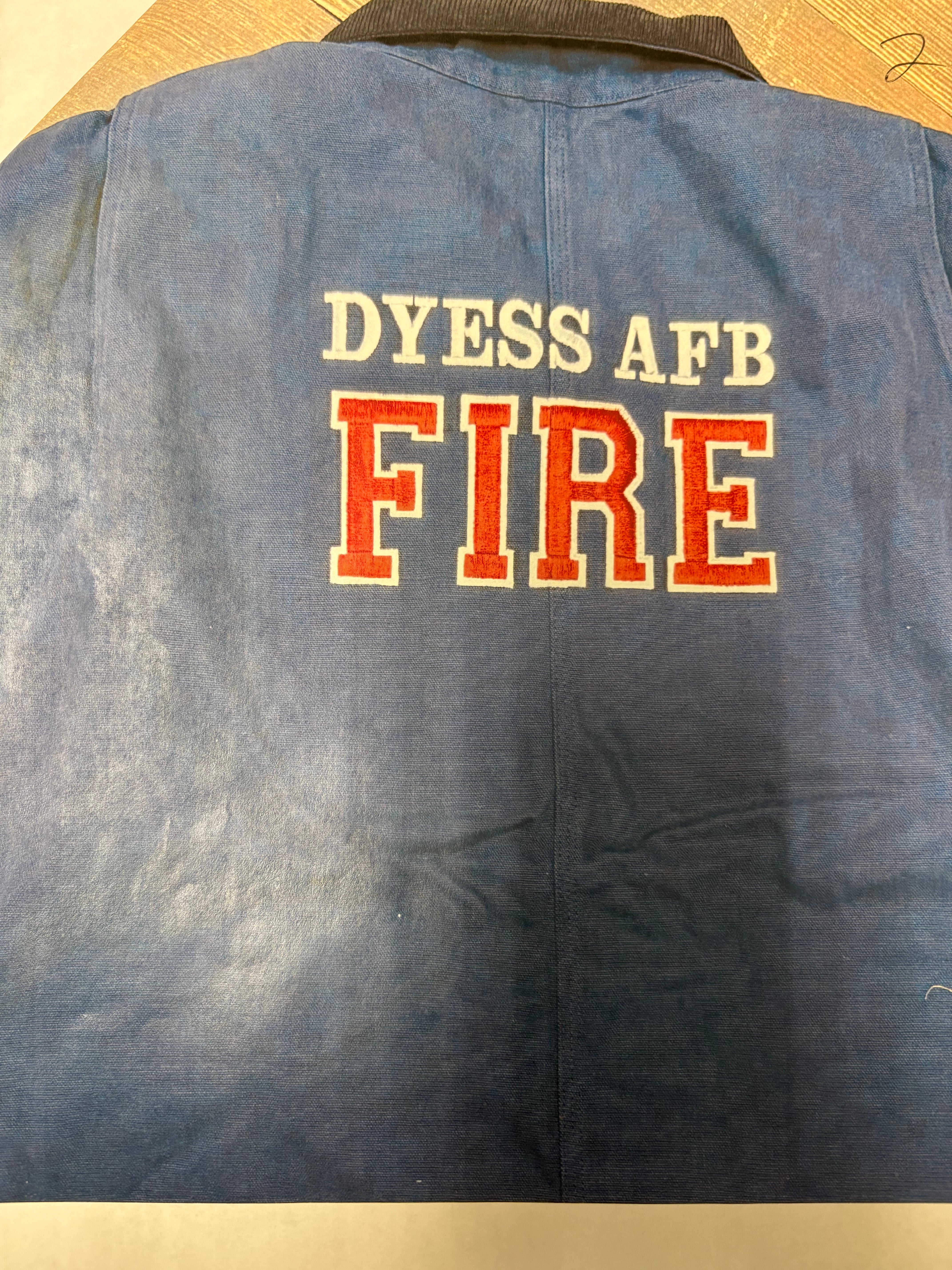 This is a Pre-Order! Grab a Dyess Firefighters Association Firemans chore jacket today! Full color monogram on left chest and Dyess Fire on full back of a Navy jacket. Name and rank on the right chest in white.