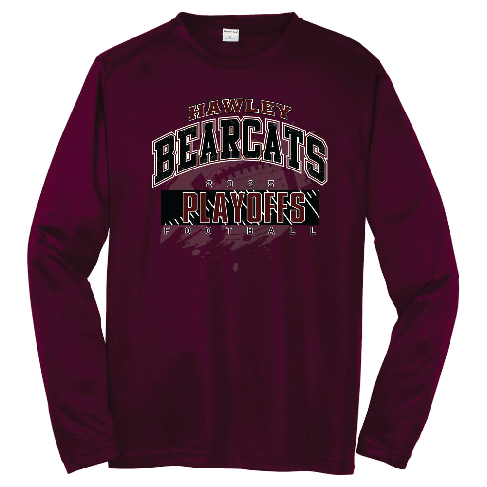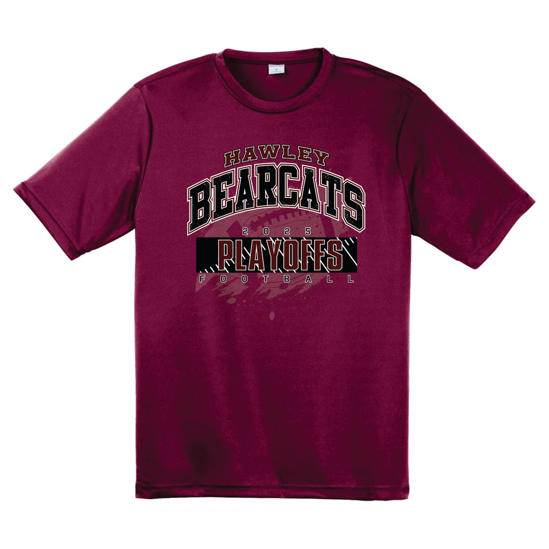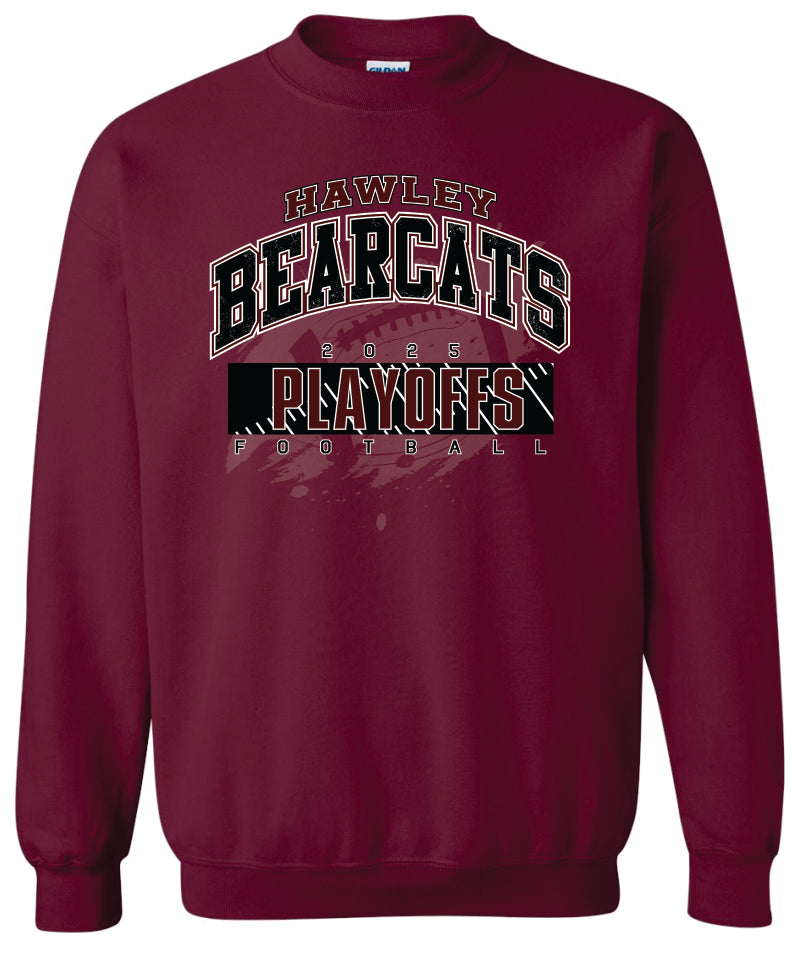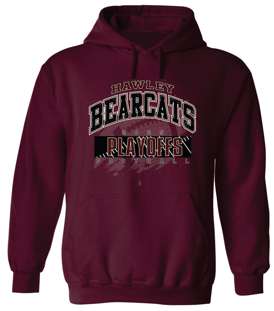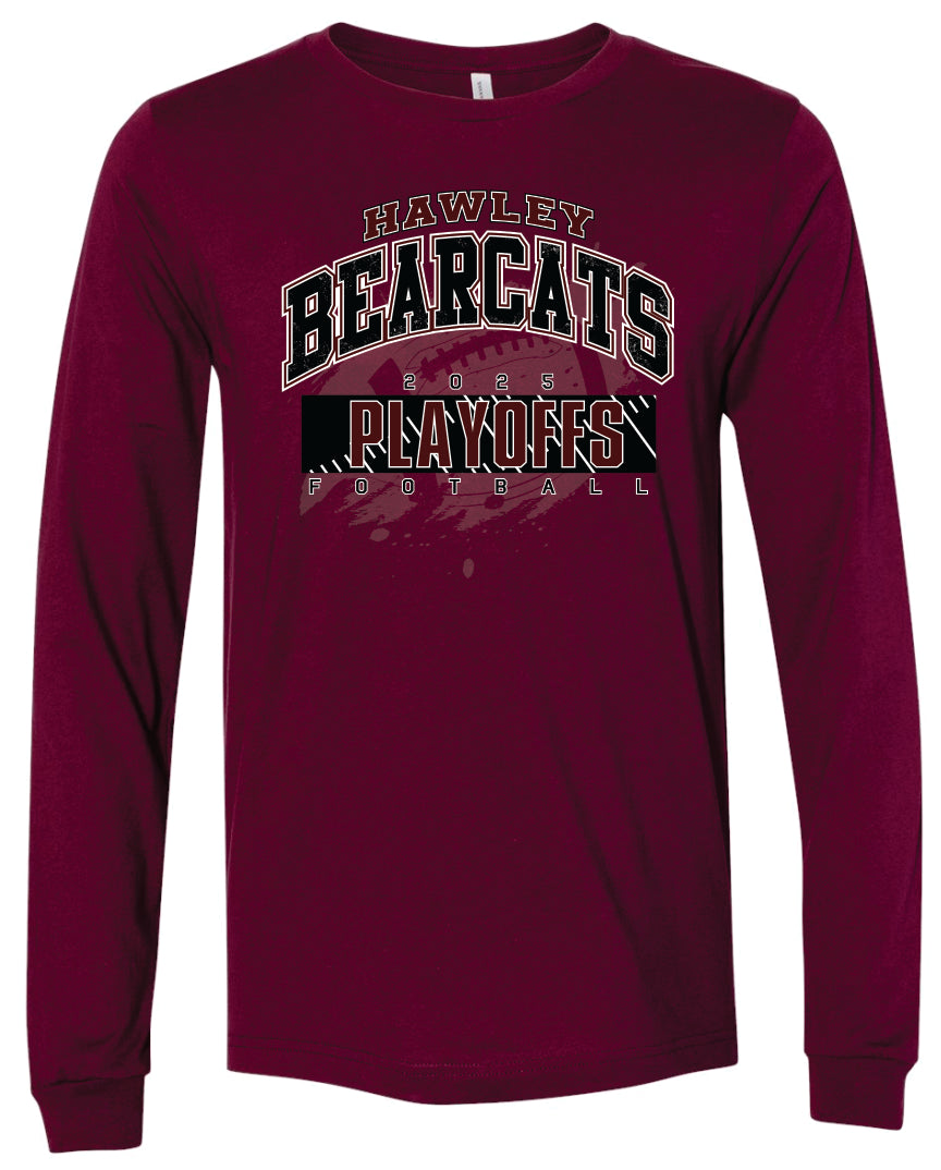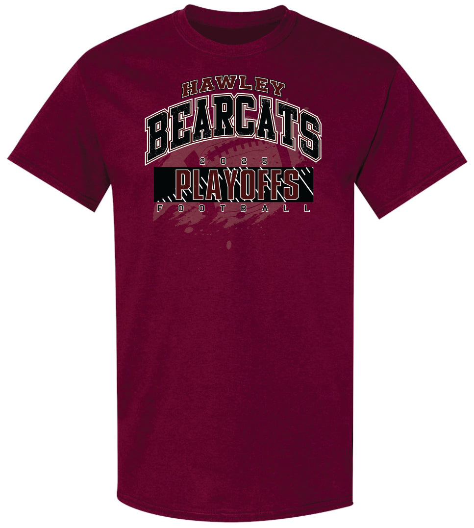This is a Pre-Order! The DEADLINE to order is on Sunday, November 9th. Show your support for the Hawley Bearcat Football team with some Playoff merchandise. Hawley Football design on the front with the Roster on the Back of a Maroon Tee. 6 different shirt options to choose from Short Sleeve or Long Sleeve - Cotton or Wicking, Crewneck Sweatshirt or Hoodie.