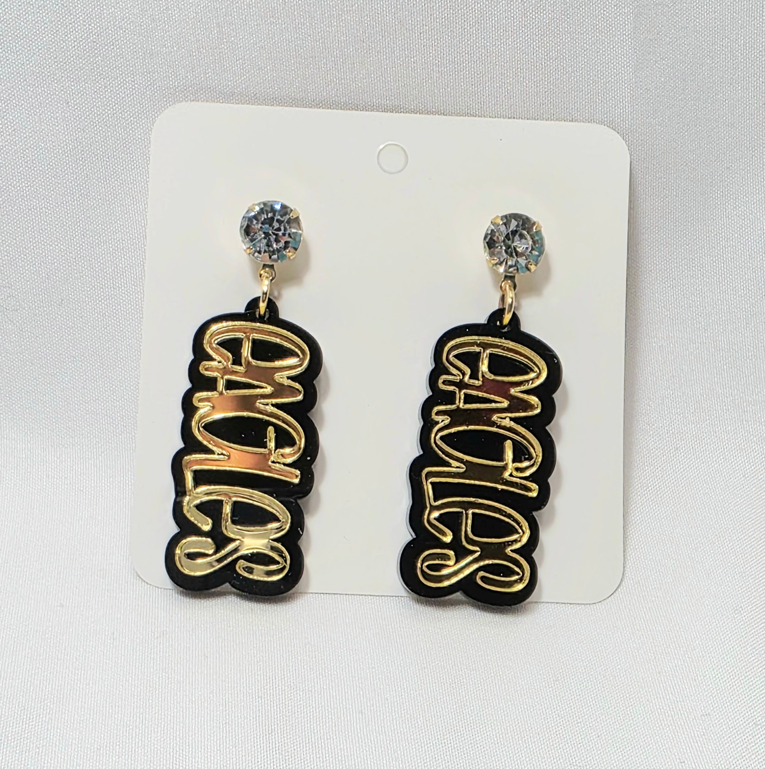 Custom Eagles Game Day earrings with glitter acrylic 3D.  Eagles is 2 inches long.