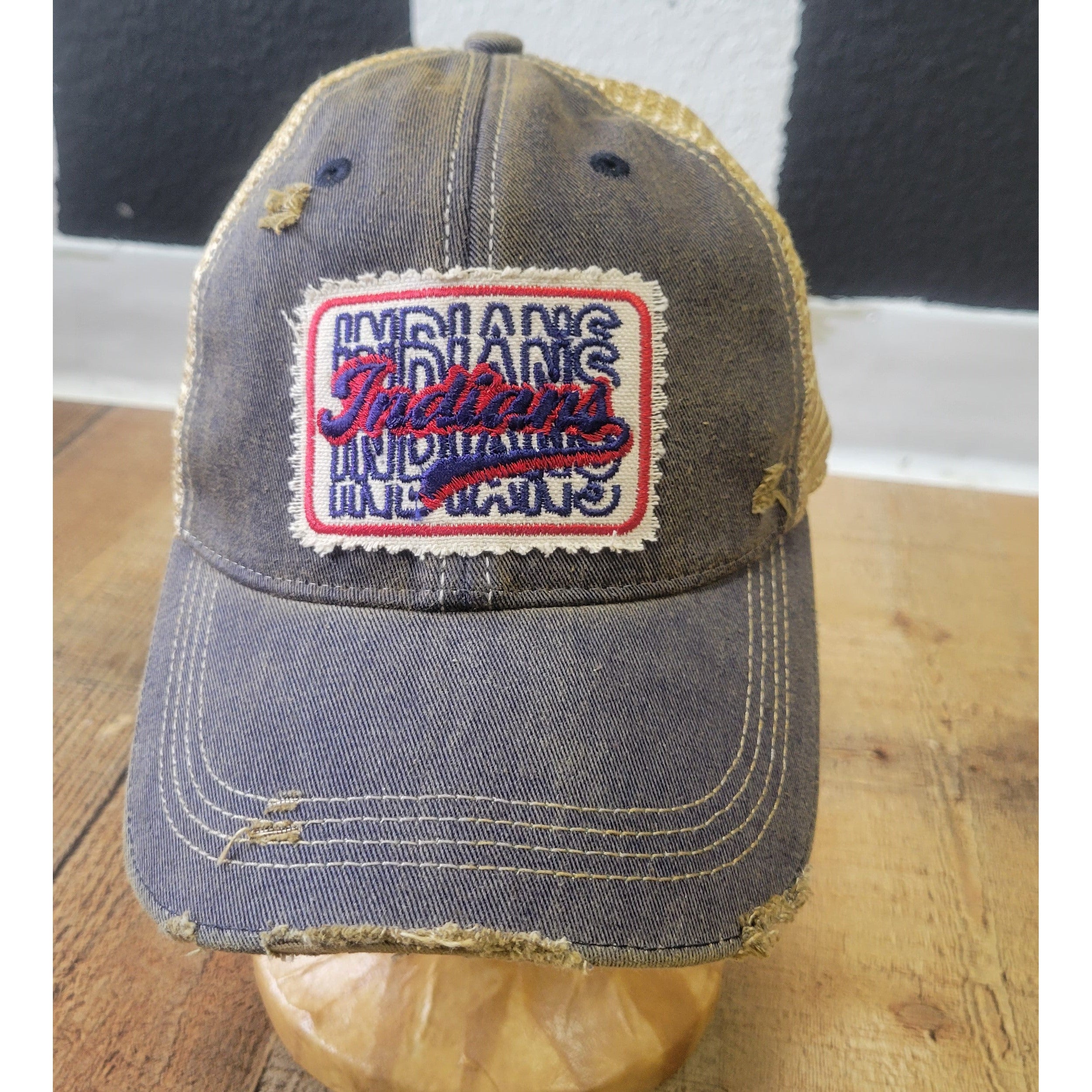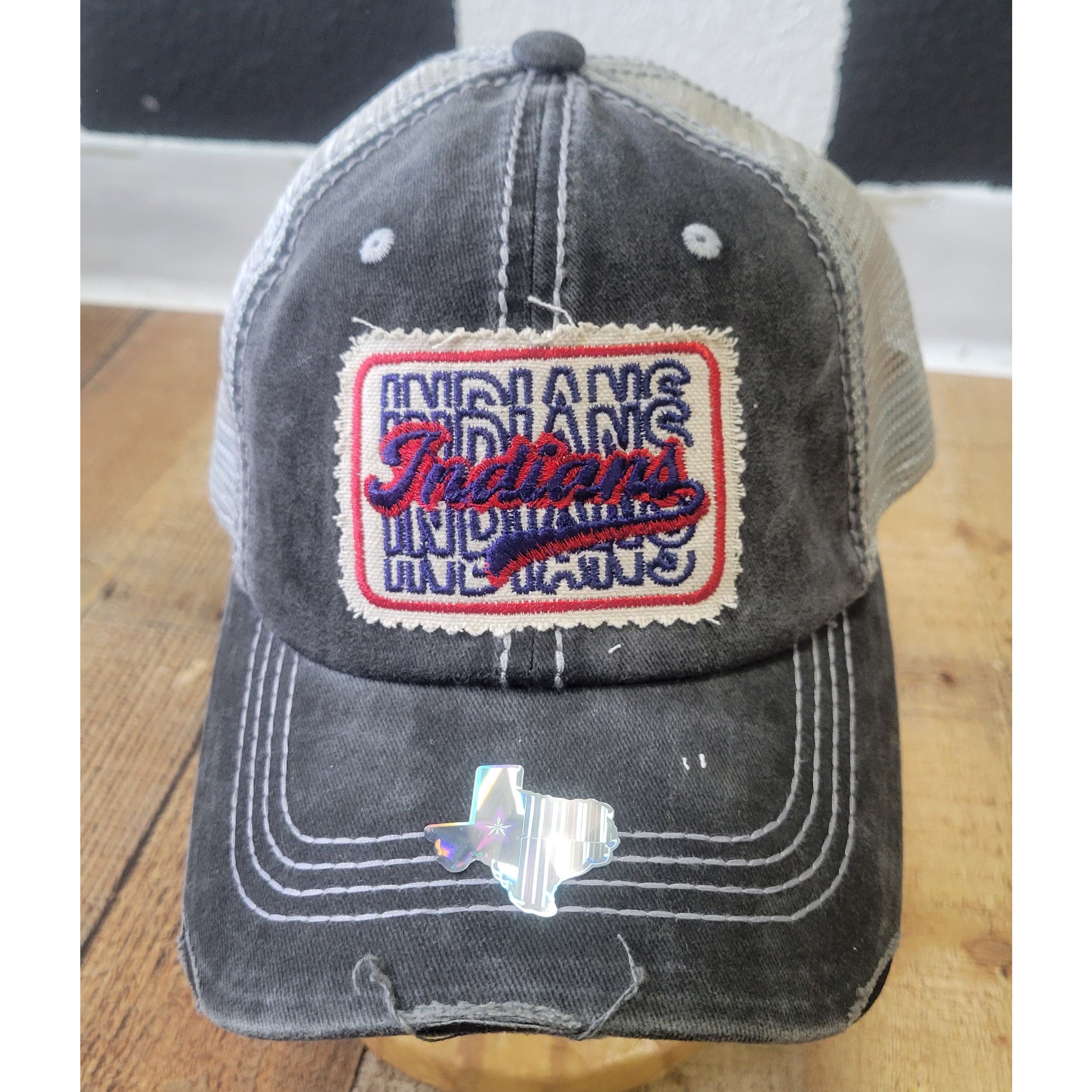 Show your spirit in this Indians w/ Script Repeat Patch distressed Mesh Cap!  The embroidered patch makes it so fun.