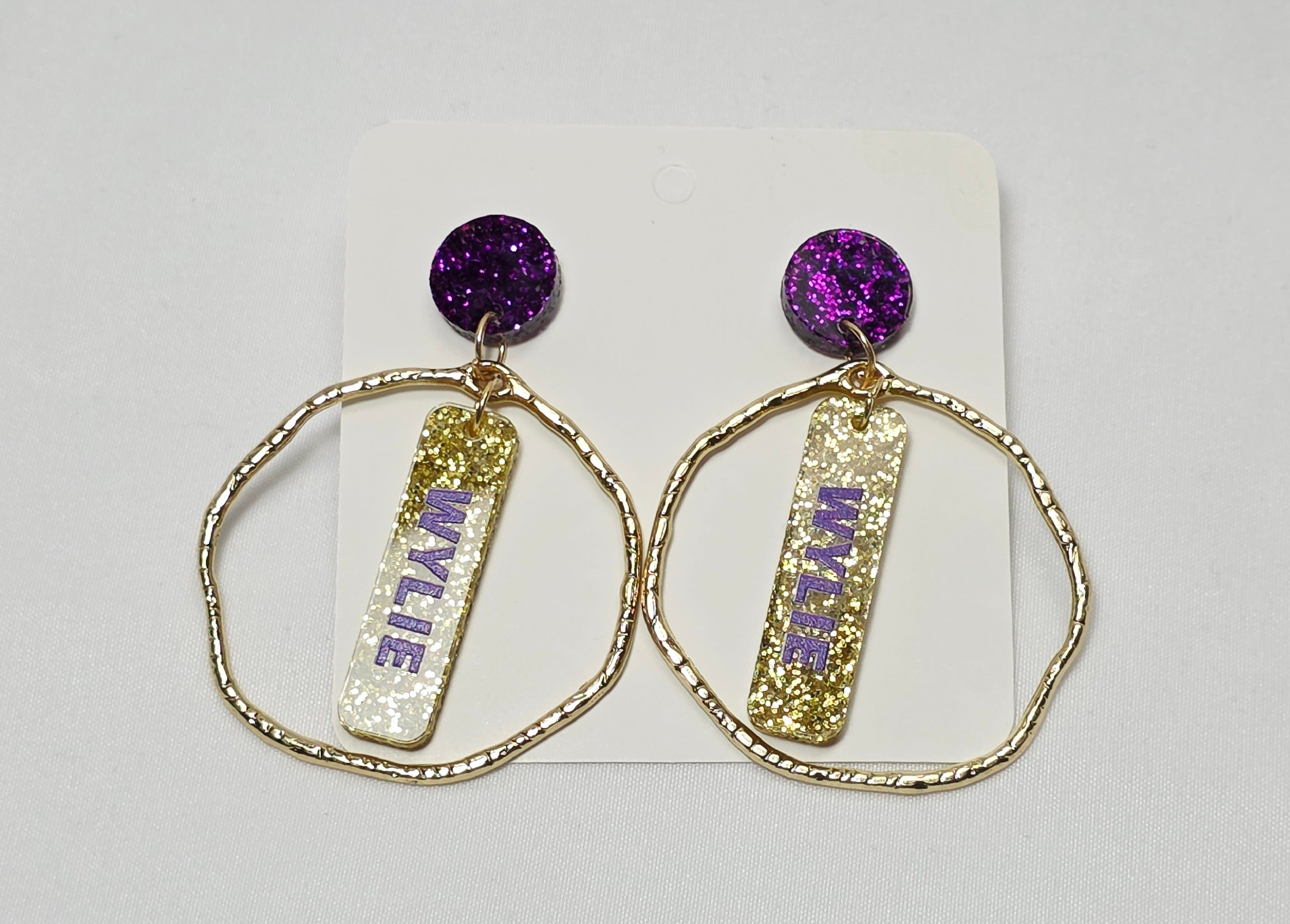 Custom Wylie Game Day earrings with glitter acrylic top and metal circle.