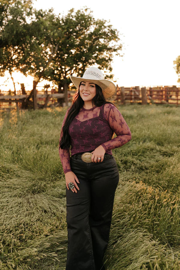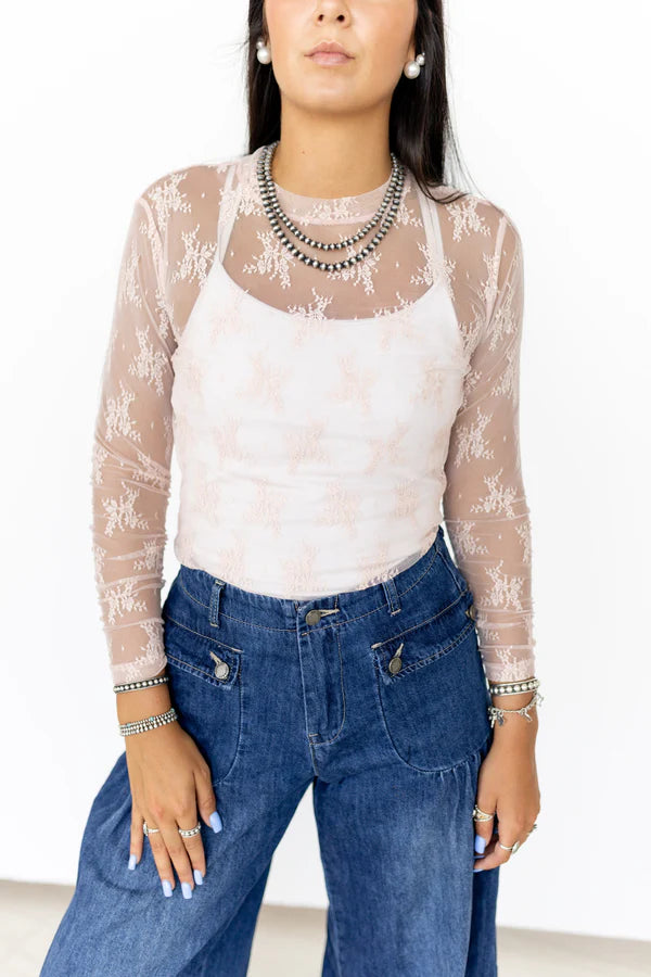 This elegant sheer lace top features long sleeves and a delicate floral pattern, perfect for adding a touch of sophistication to any outfit. Designed for versatility, it can be worn on its own for a bold, feminine look or layered over a tank or bralette for more coverage. The lightweight, breathable fabric offers comfort while the fitted silhouette provides a flattering fit.