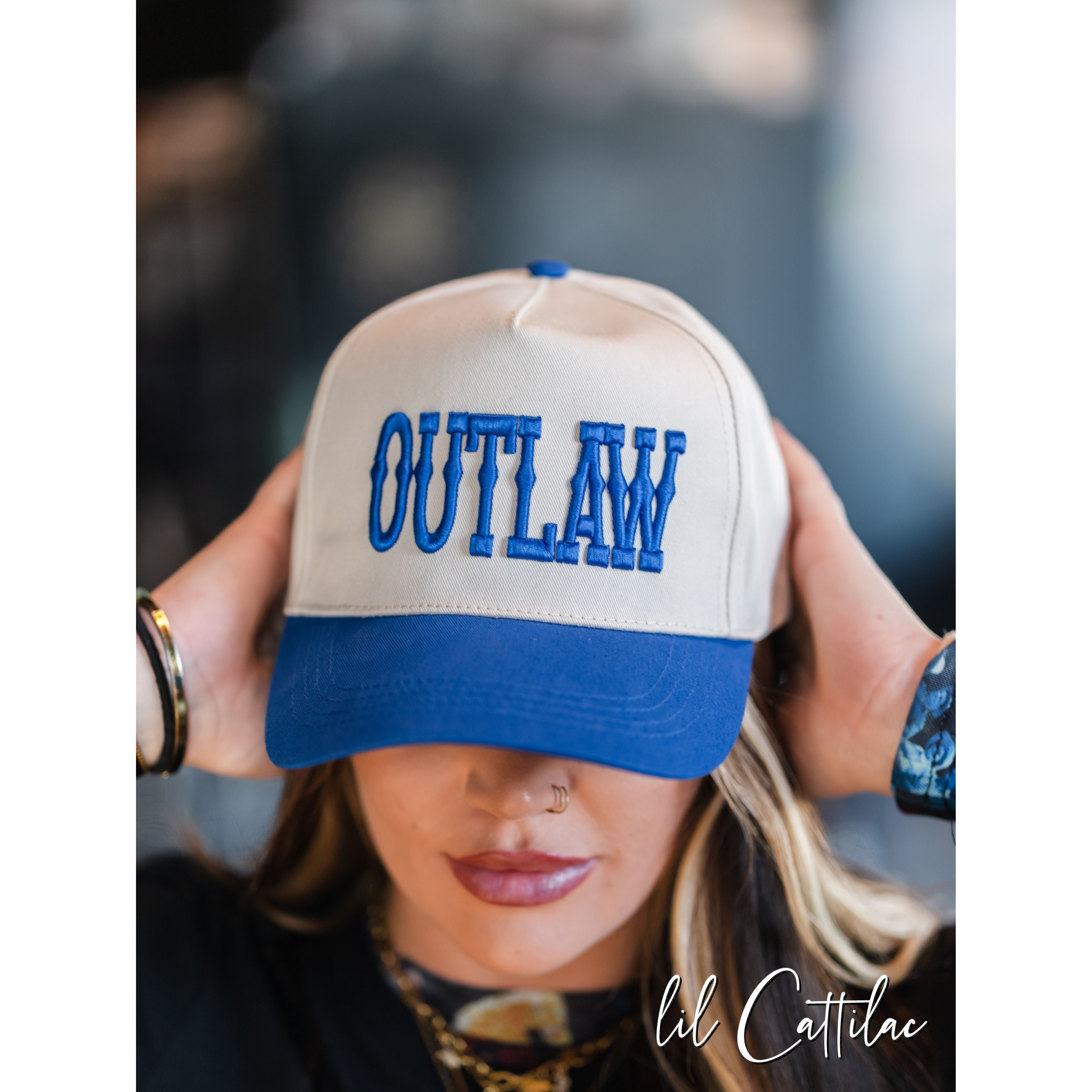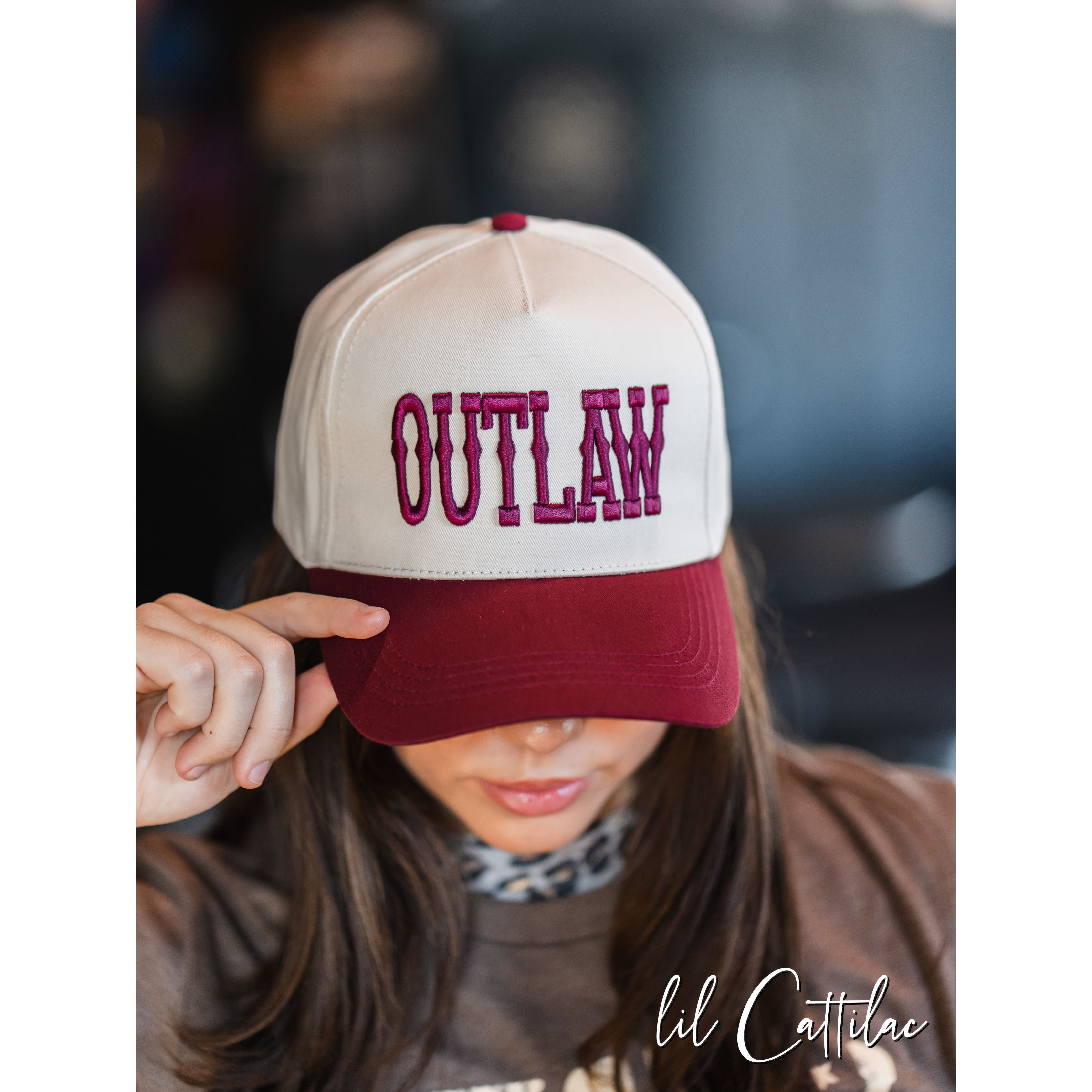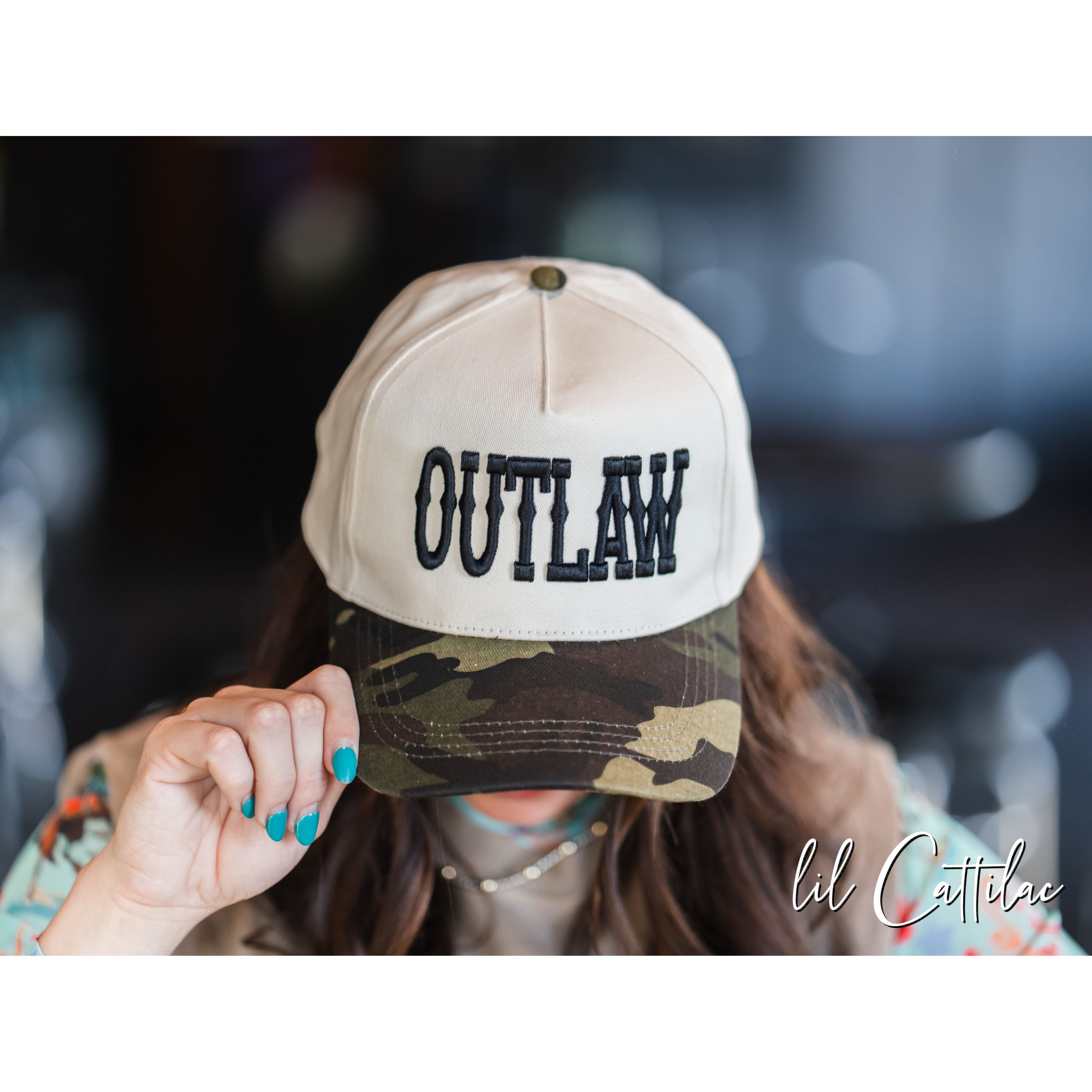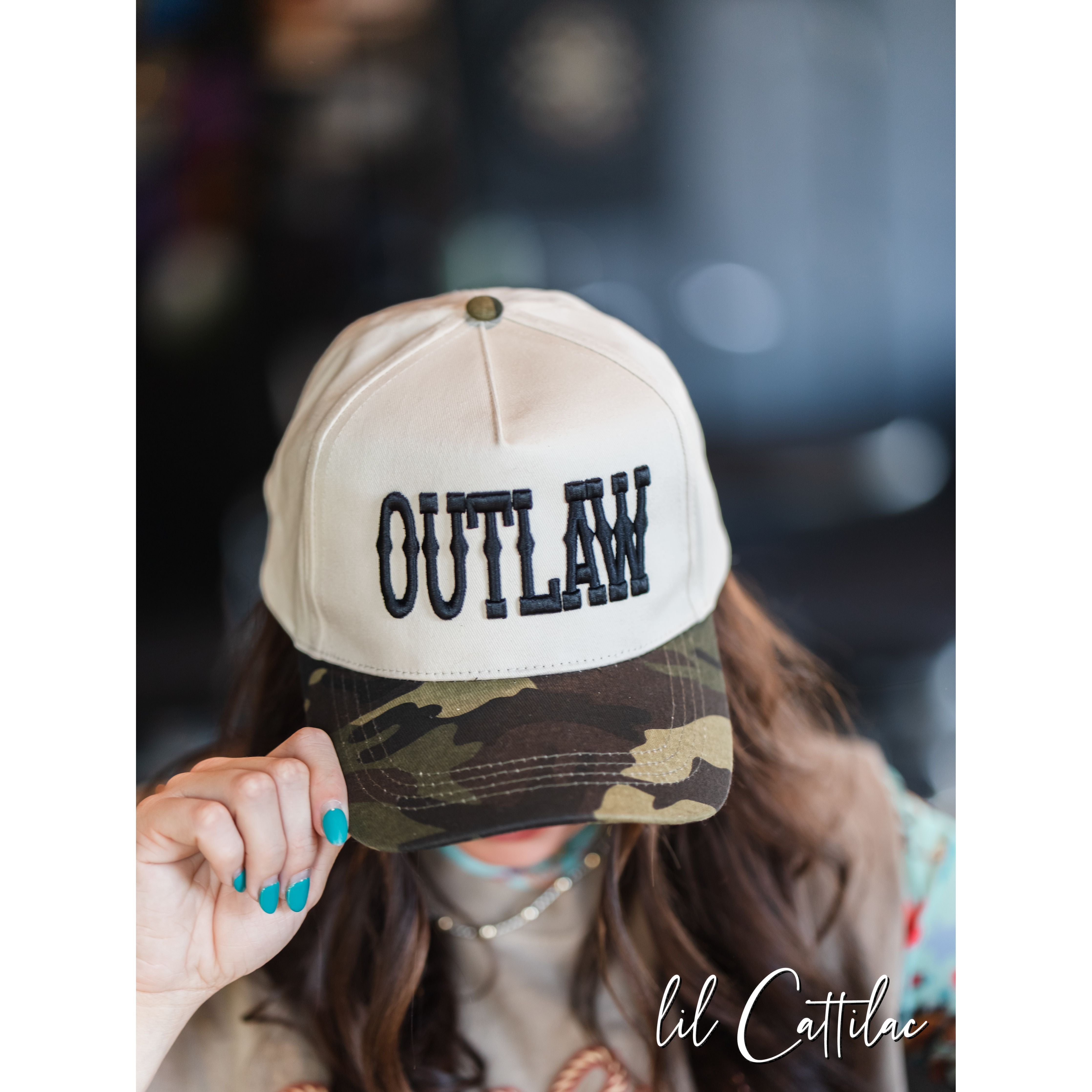 Accessorize any outfit with an Outlaw stitched with puff on a Trucker Cap! The 3D embroidery makes it so fun.