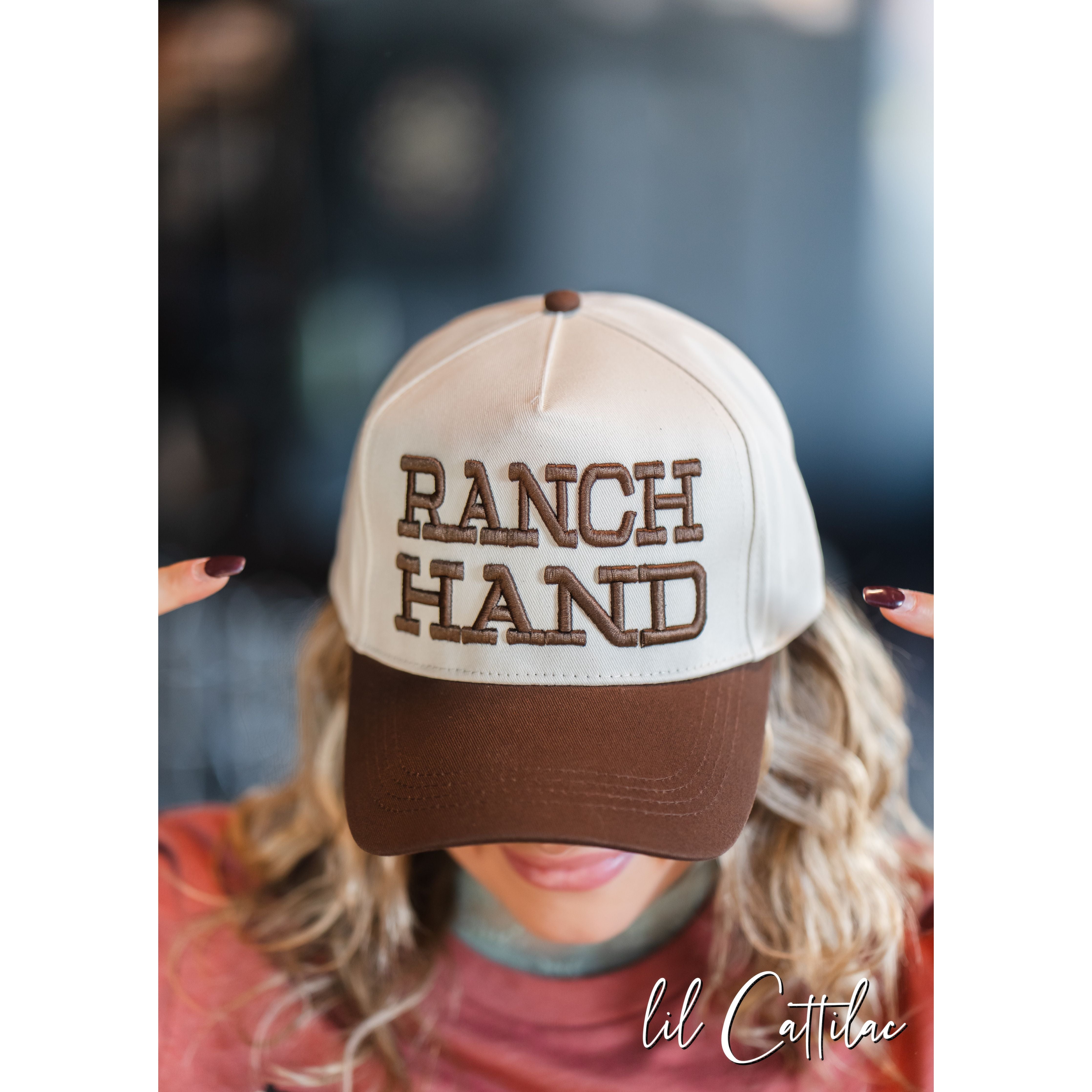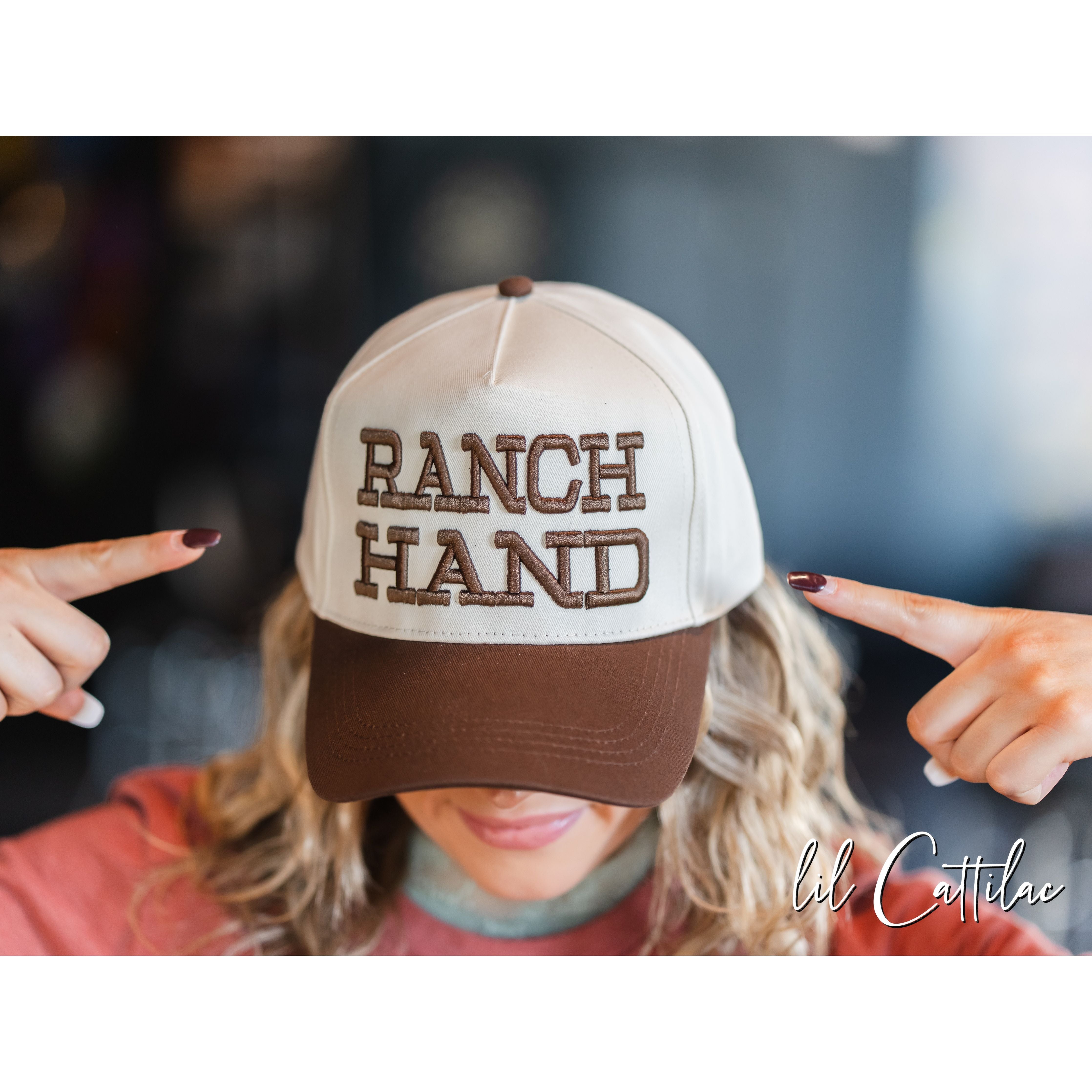 Accessorize any outfit with a Ranch Hand stitched with puff on a Trucker Cap! The 3D embroidery makes it so fun.