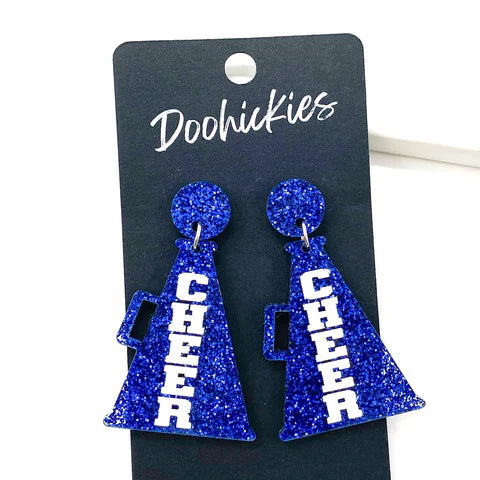Cheer on your team with our 2" Painted Cheer Megaphone Dangles! These custom spirit earrings are shaped like a megaphone and come in a variety of glitter colors to match your school spirit. Show off your unique style and support with these quirky and playful earrings. Go team!