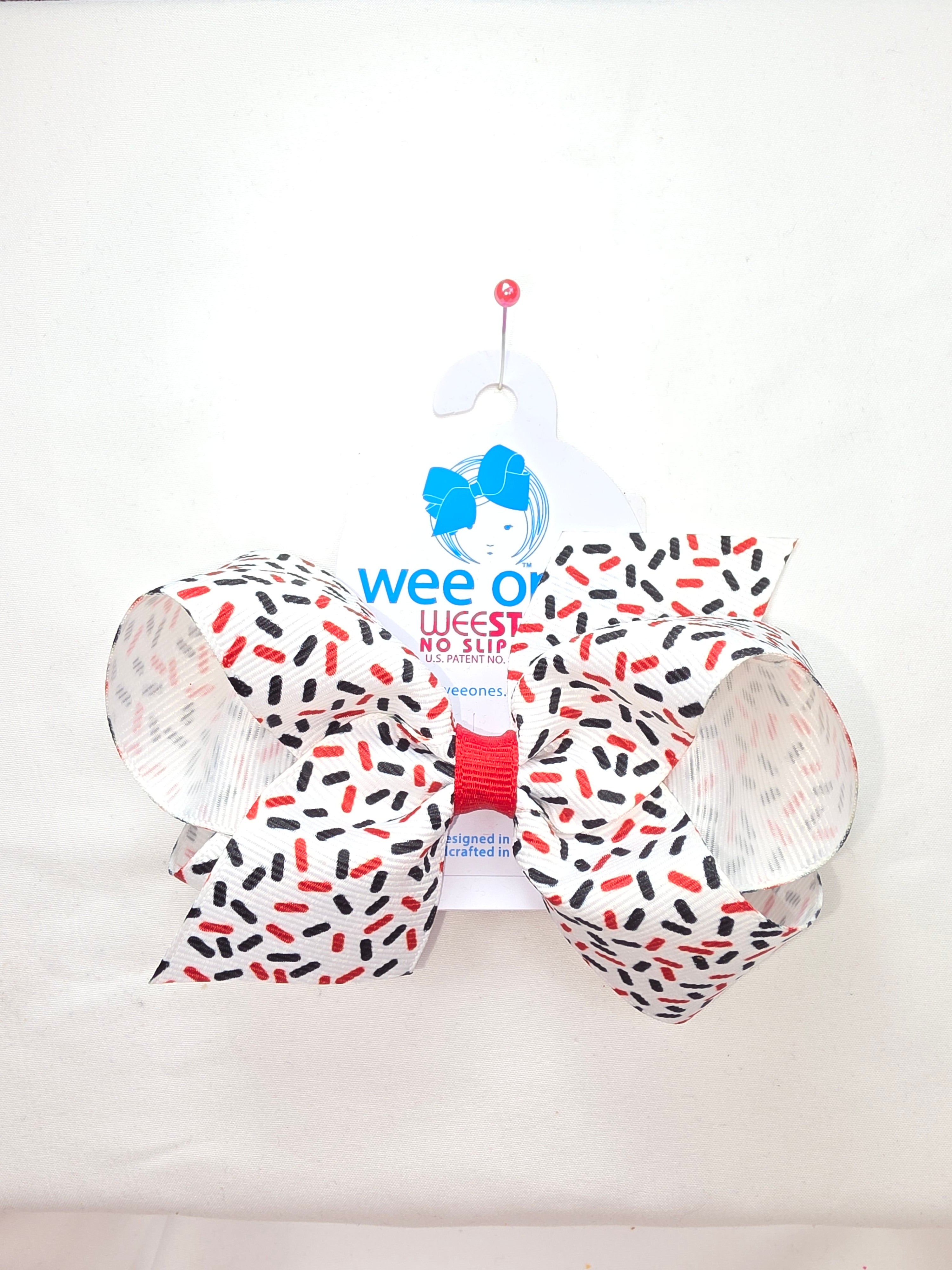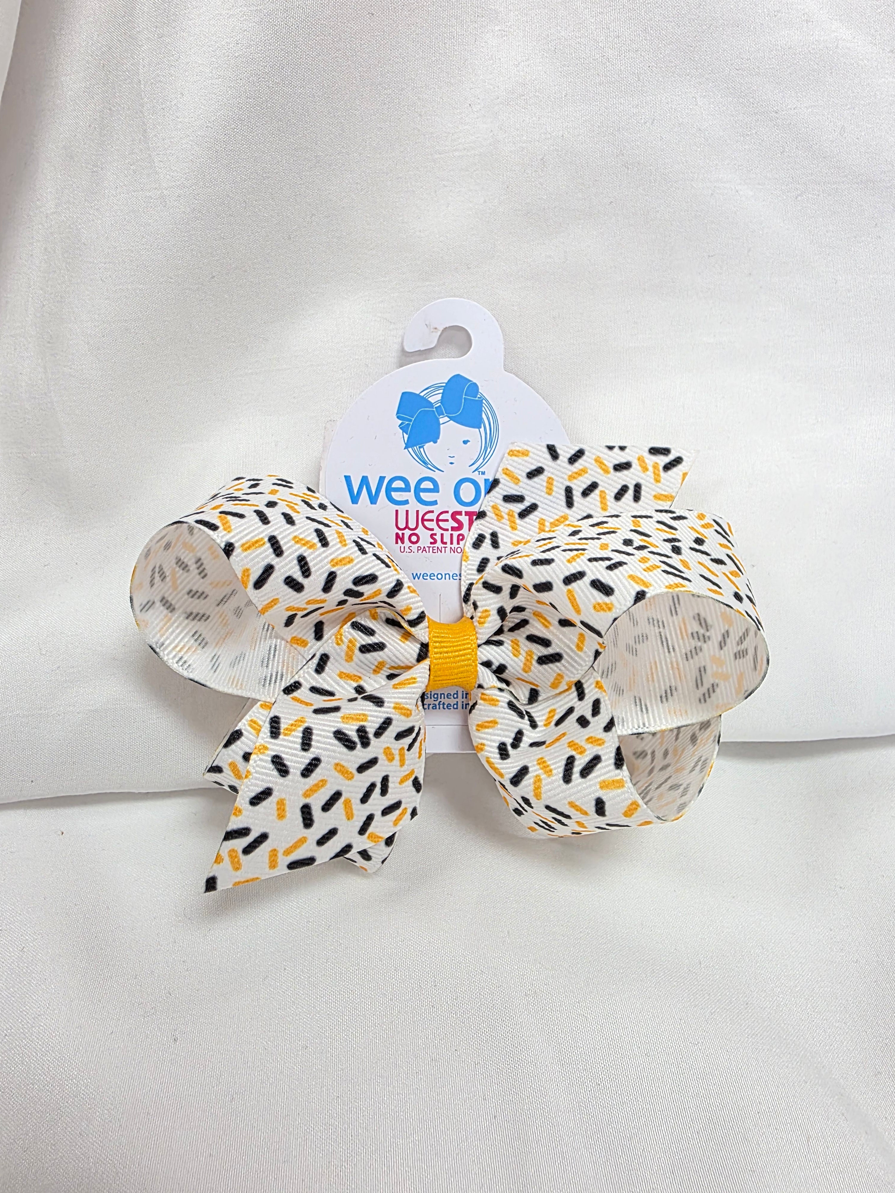 Make her 'do stand out with this fun & sparkly medium confetti print bow! Perfect for any Game Day who wants to light up the room! This bow is sure to stay in her hair all day with our patented WeeStay™ no-slip hair clip.