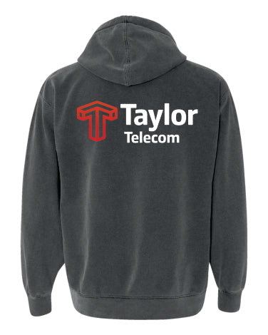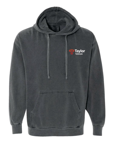 Taylor Telecom Comfort Colors hooded sweatshirt with Taylor Telecom logo screen printed on the left chest and full back.  Available in pepper.