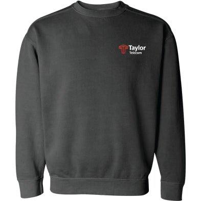 Taylor Telecom Comfort Colors crewneck sweatshirt with Taylor Telecom logo screen printed on the left chest and full back. Available in pepper.